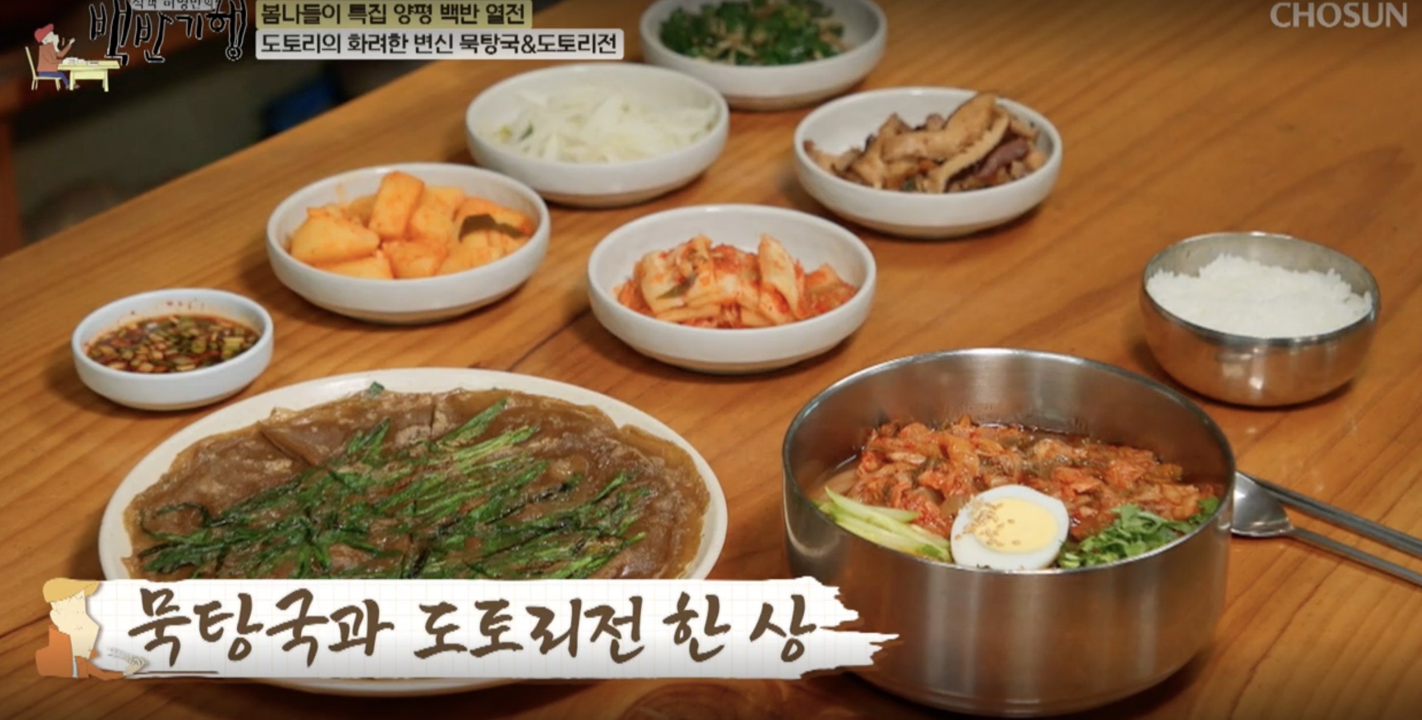 묵탕국과 도토리전을 한 상으로 먹을 수 있다. 도토리전은 숙성을 해서 더 쫄깃한 매력이 있다.