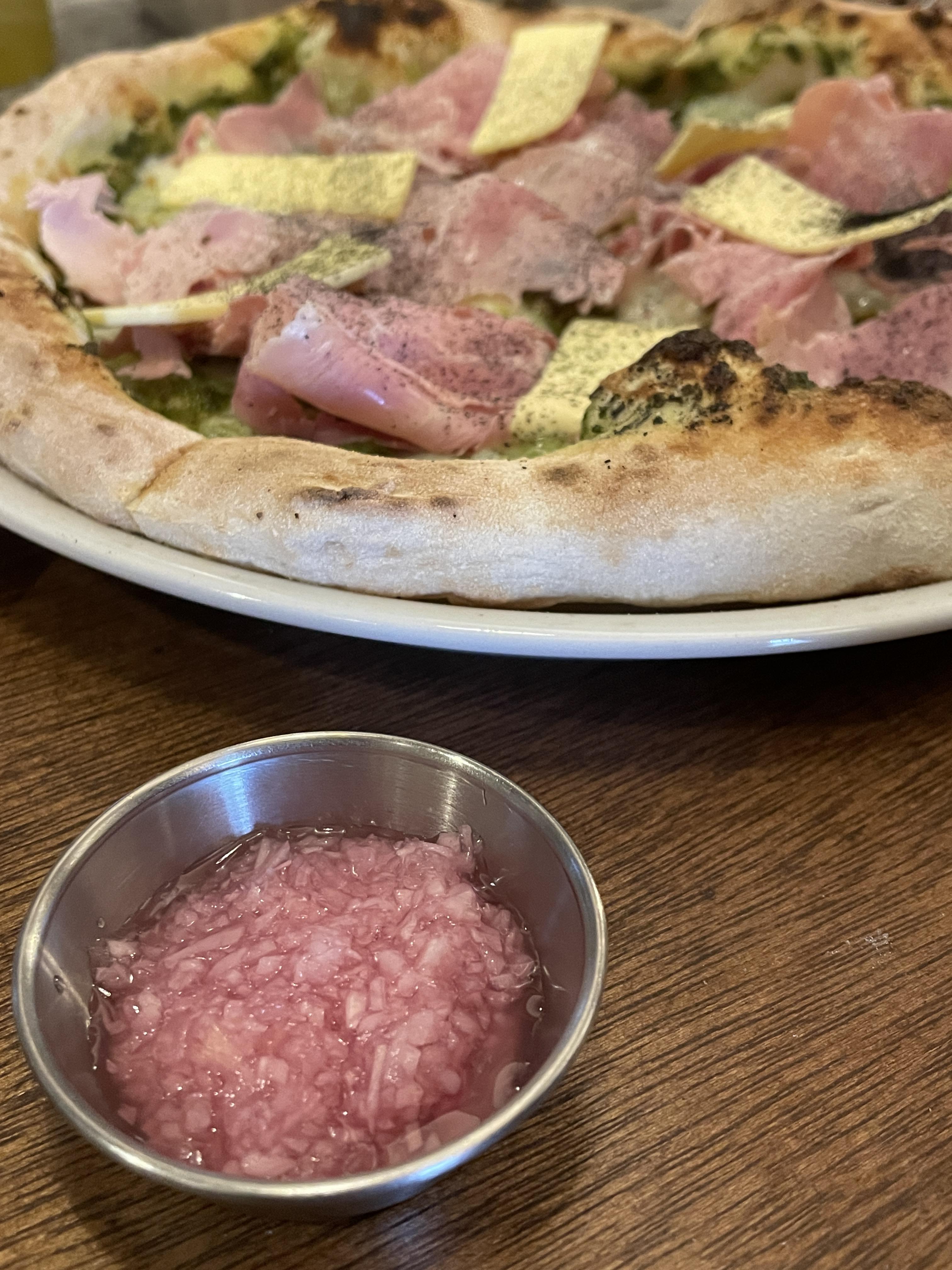 새콤한 샬롯을 더해 먹어야 더 맛있다. 잠봉 버터에 산미를 더해줘서 더 깔끔하고 맛이 좋아진다. 도우는 숙성이 잘 되어 그런가 쫄깃쫄깃한 식감이다.