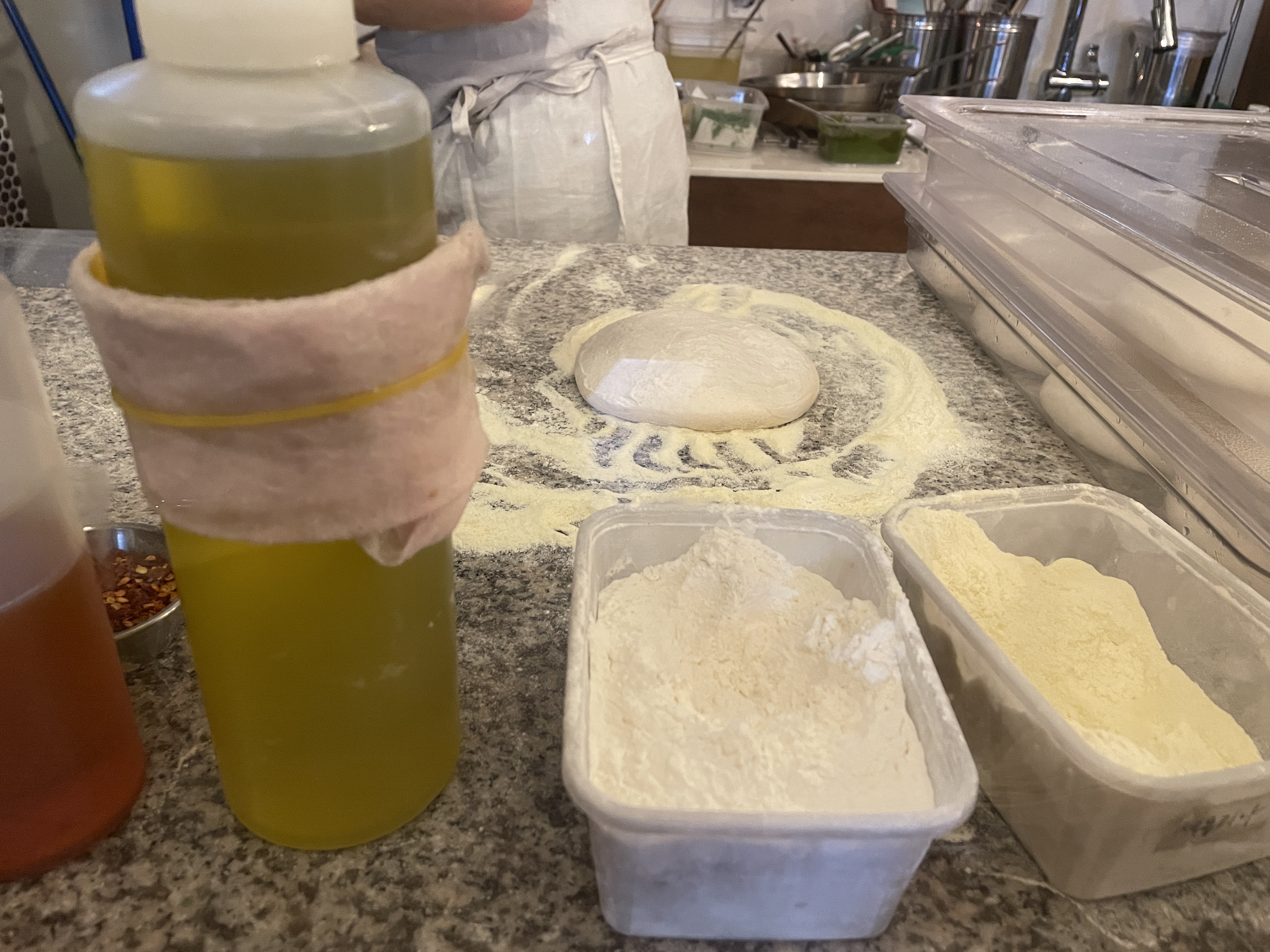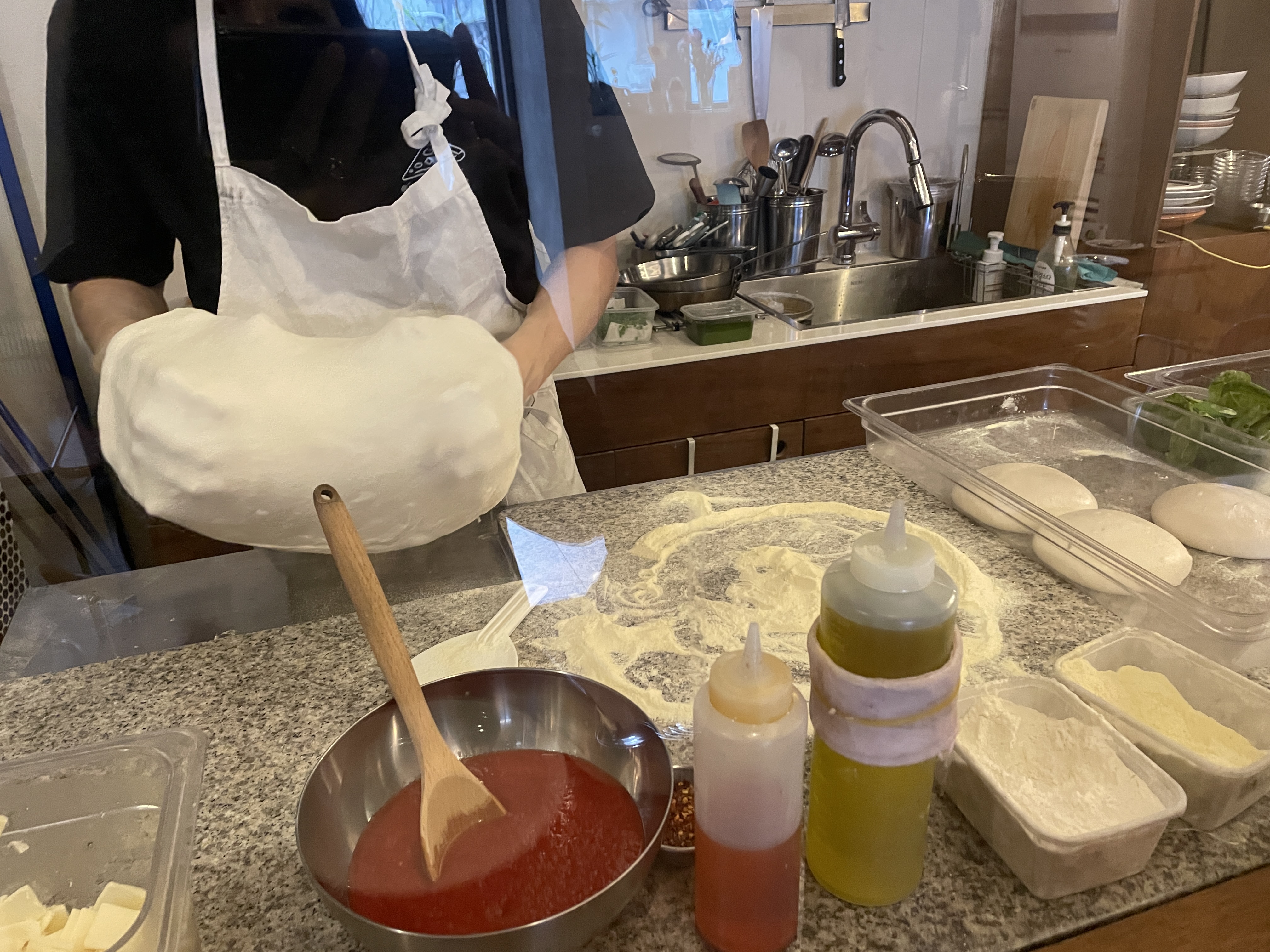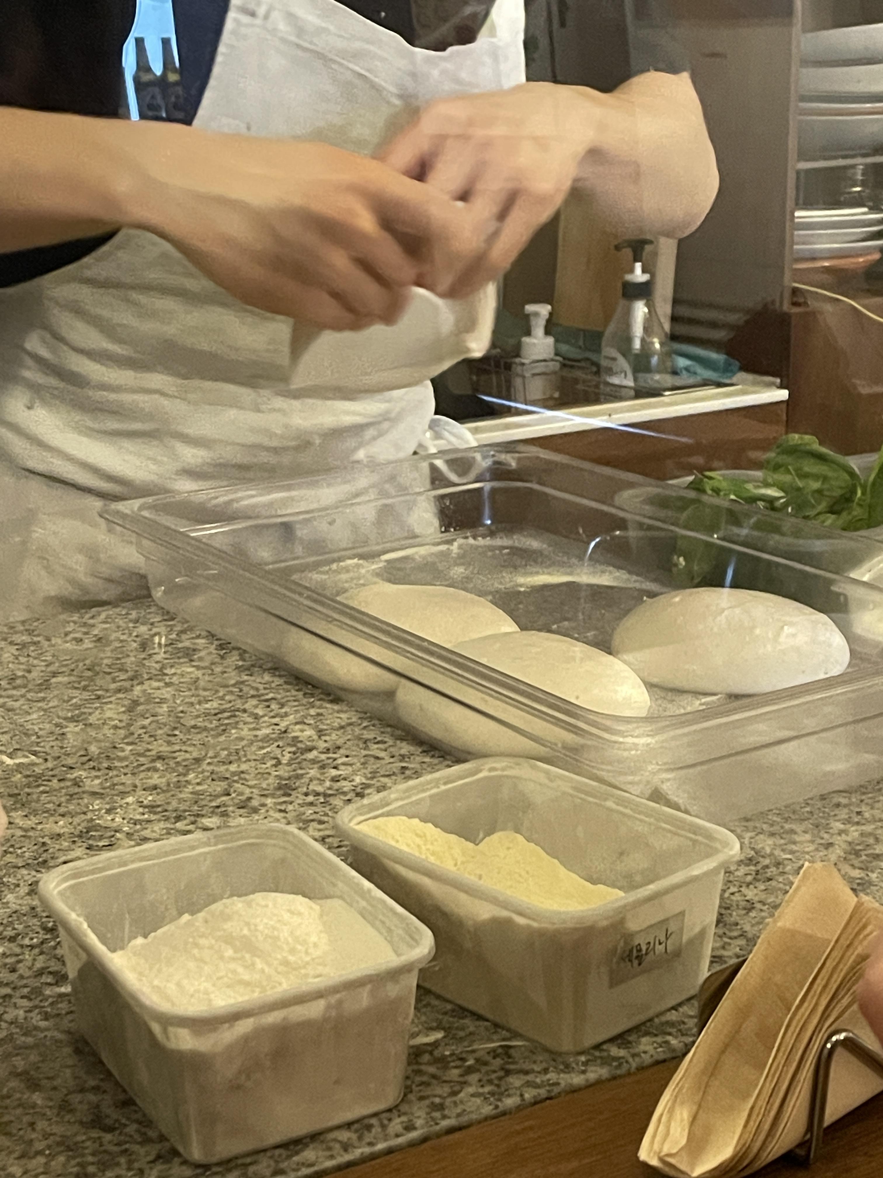 피자를 주문하면 세몰리아 깔고, 숙성된 도우를 하나씩 꺼내 피자를 만드시기 시작한다.