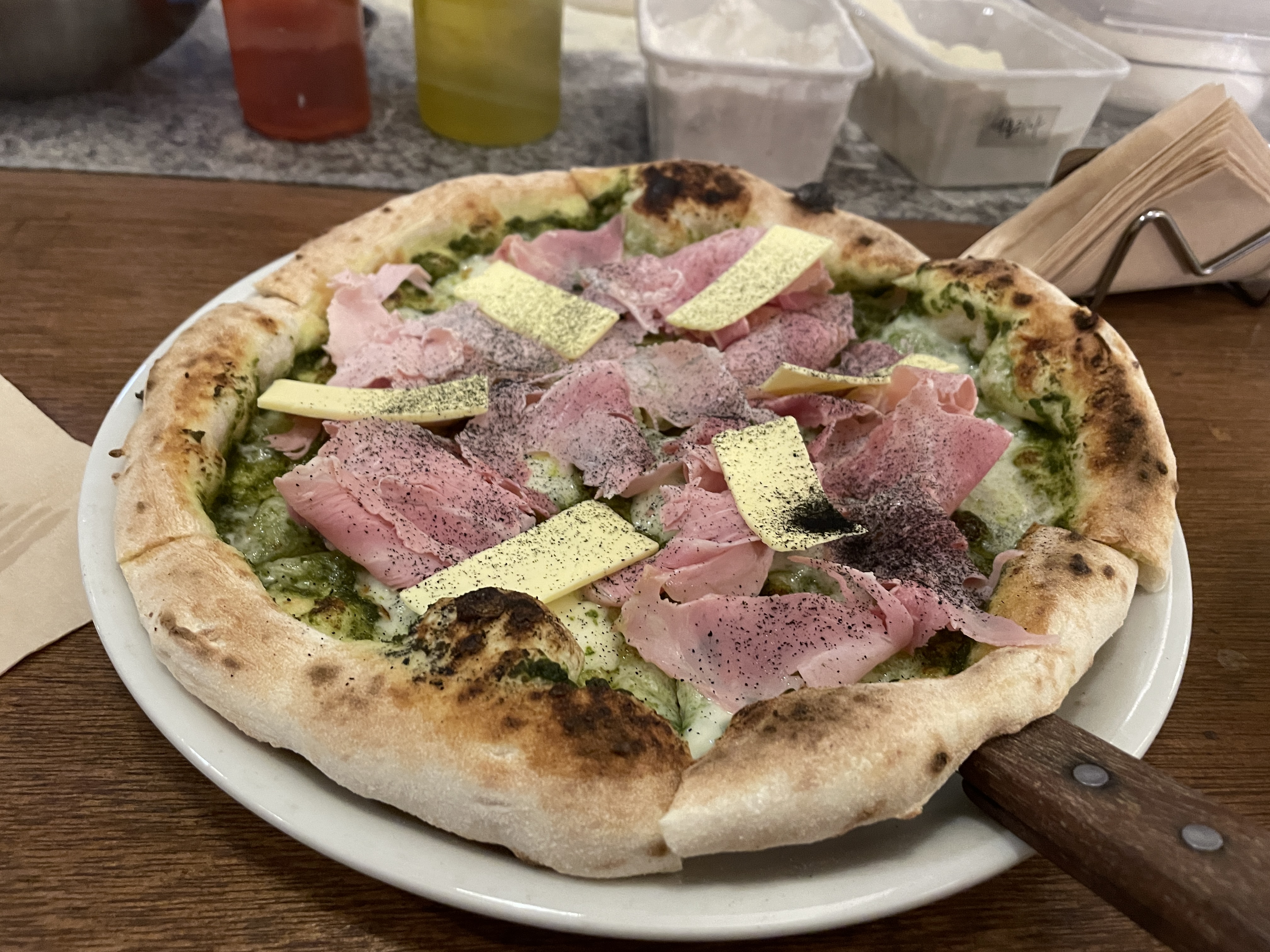 바질, 잠봉, 버터 피자는 바질페스토가 베이스가 되는 피자.