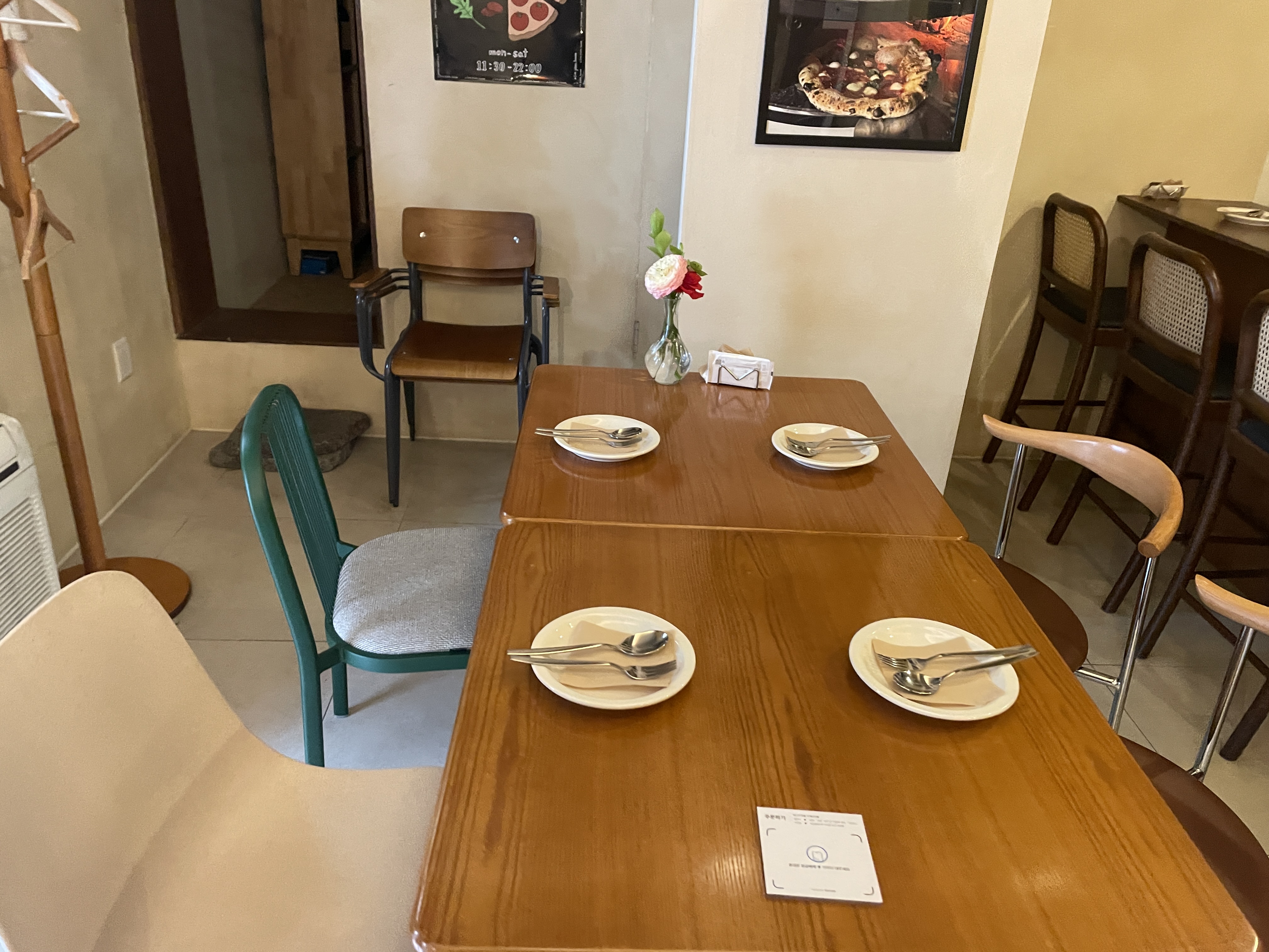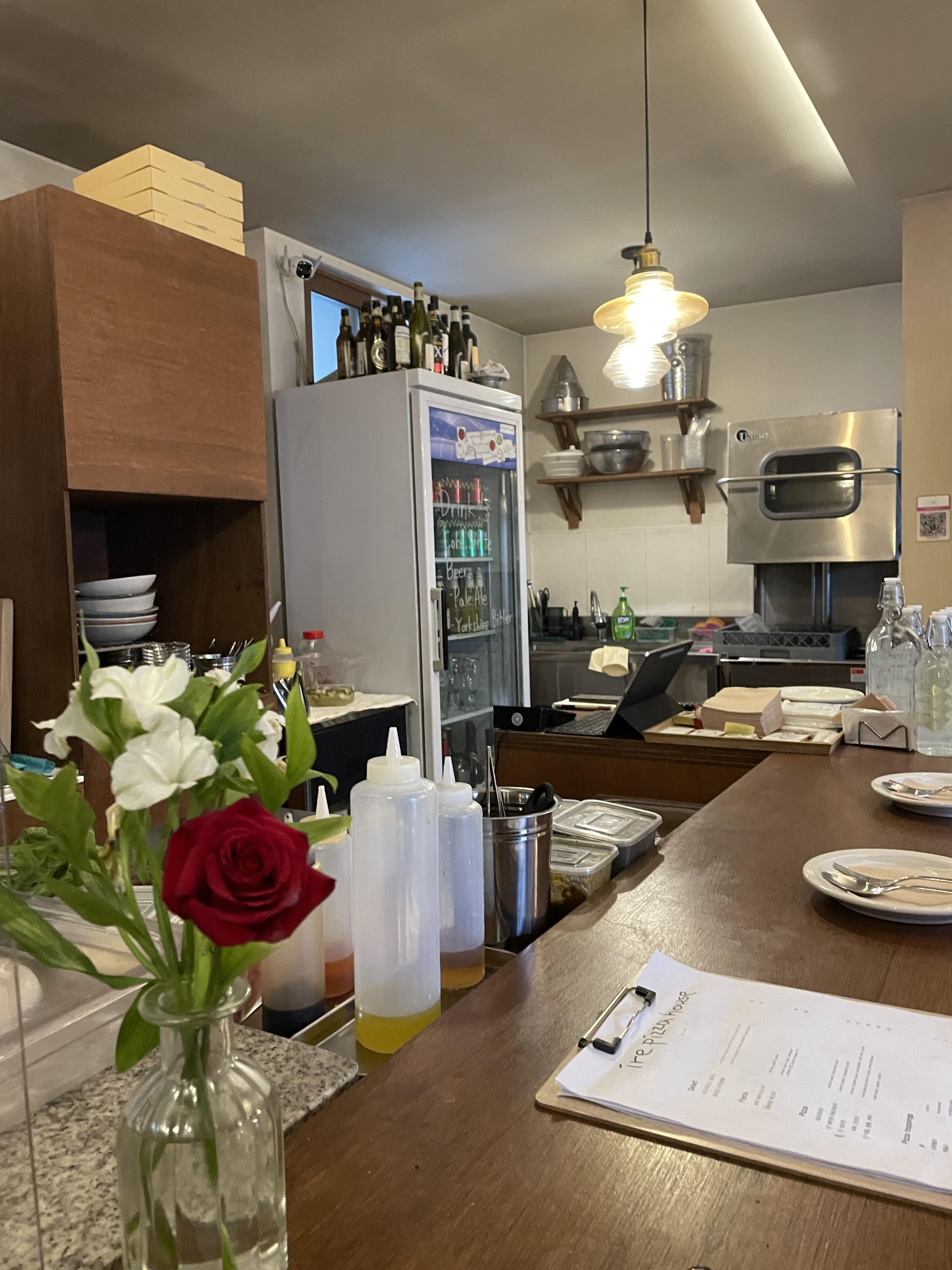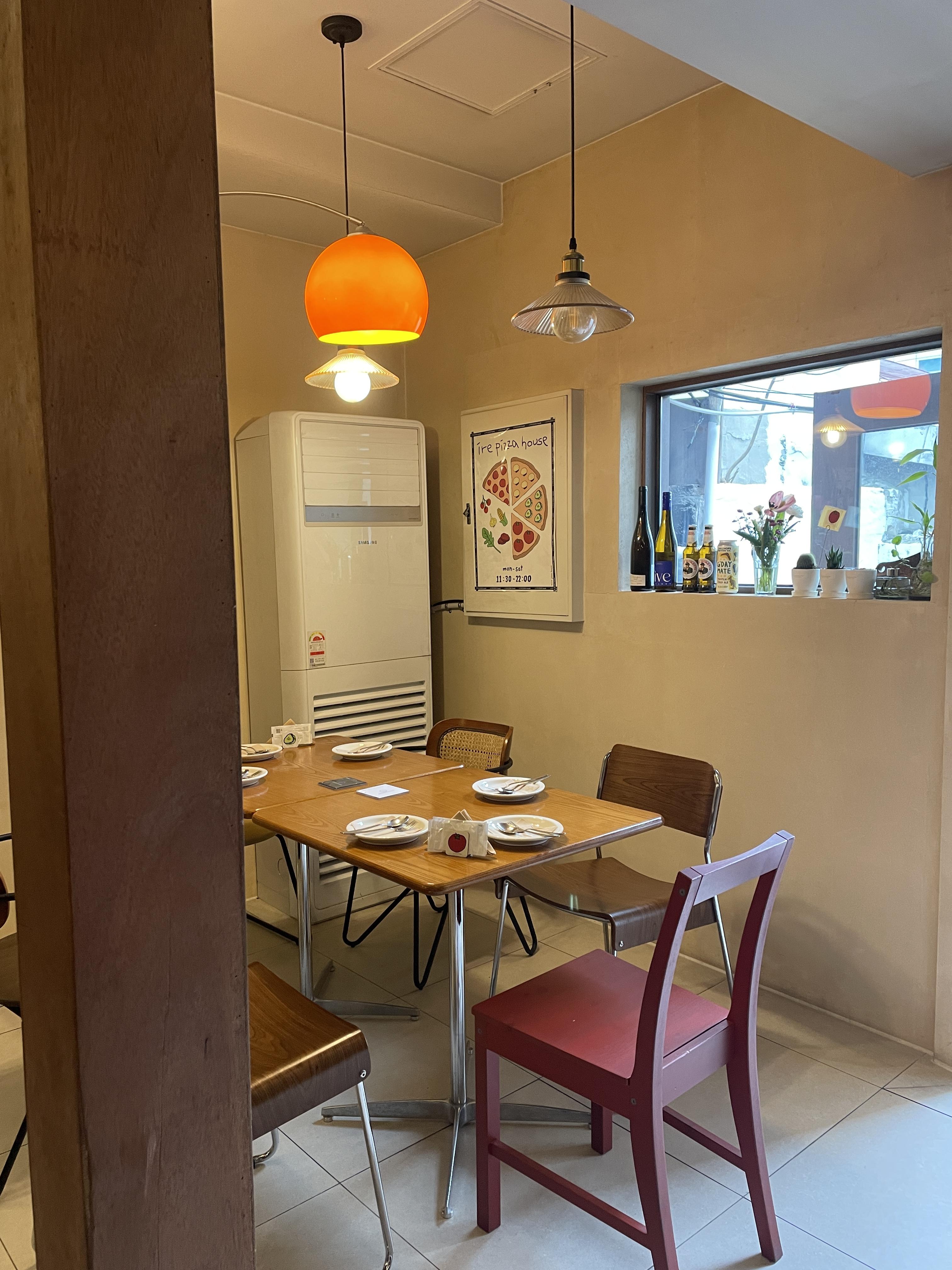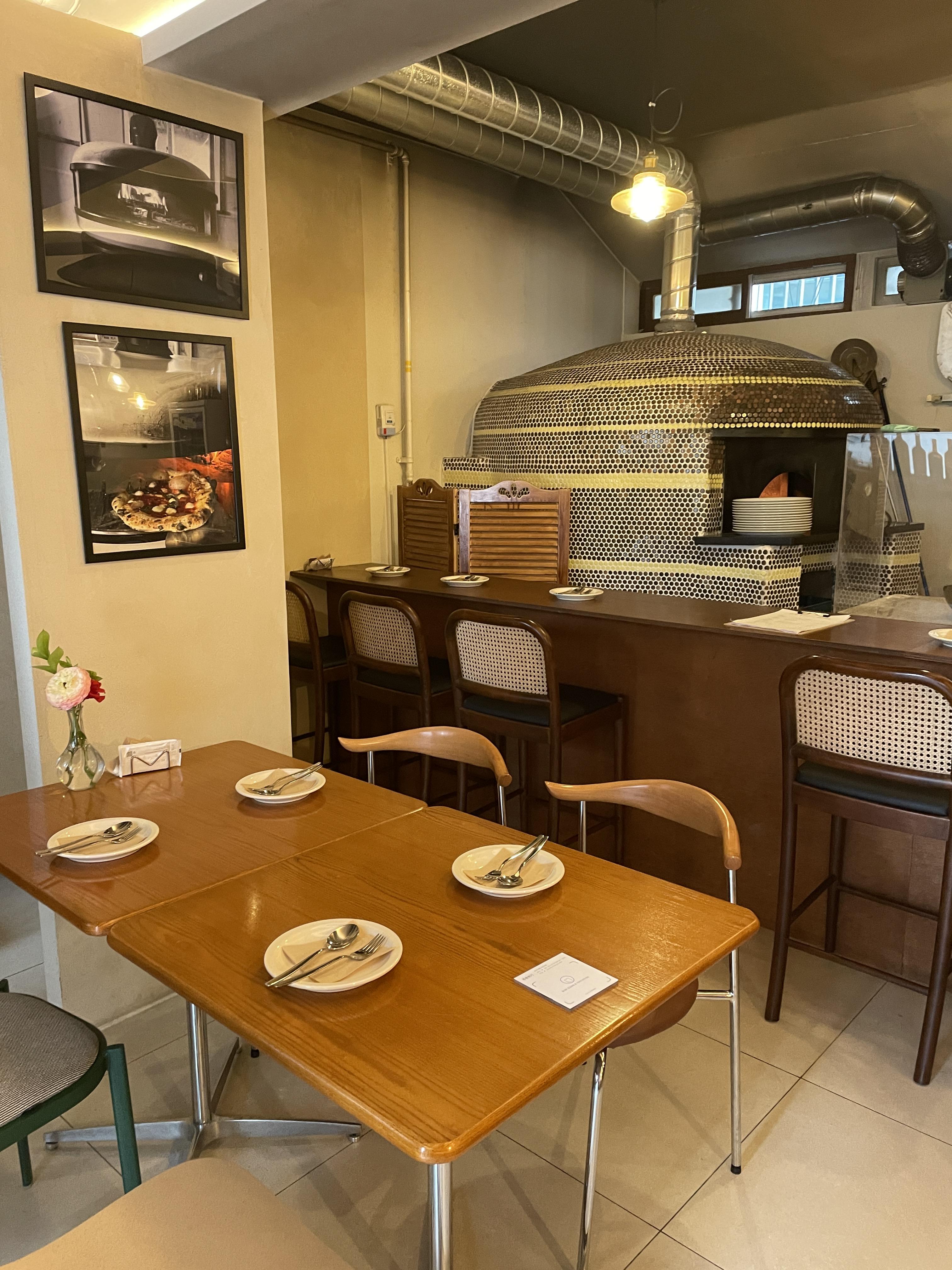 매장은 넓지 않지만 코지한 분위기다. 들어서면 딱 보이는 바좌석 쪽에 화덕이 있다. 워크인으로 가거나 2명이 방문하면 바 좌석을 앉을 확률이 매우 높다.