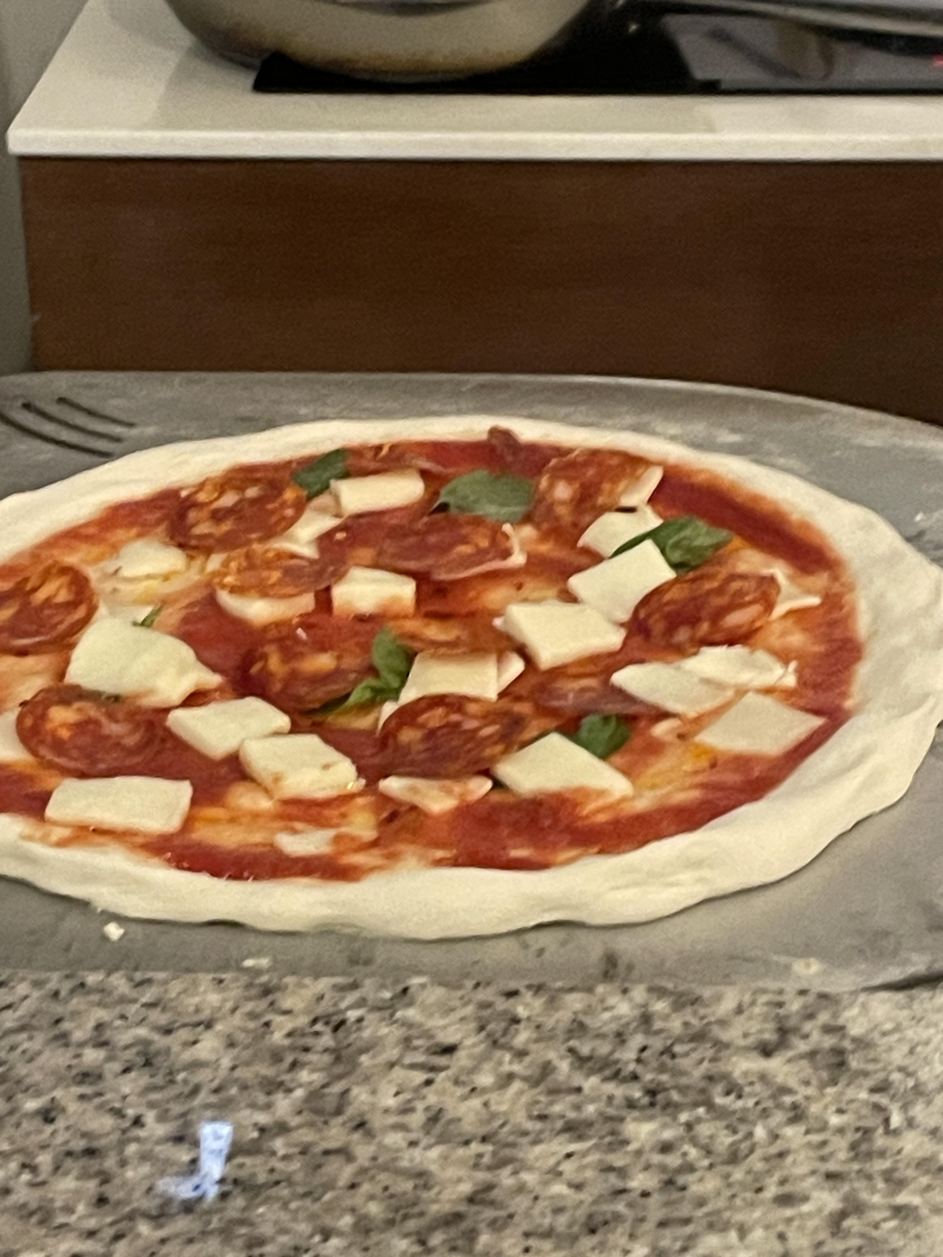 그럼 화덕에 넣기 직전 단계로 완성. 이 상태로 화덕에 들어갔다가 나온다. 화덕에 넣어 적절하게 모든 면이 골고루 익을 수 있도록 살짝 돌려주다가 빼면 끝!