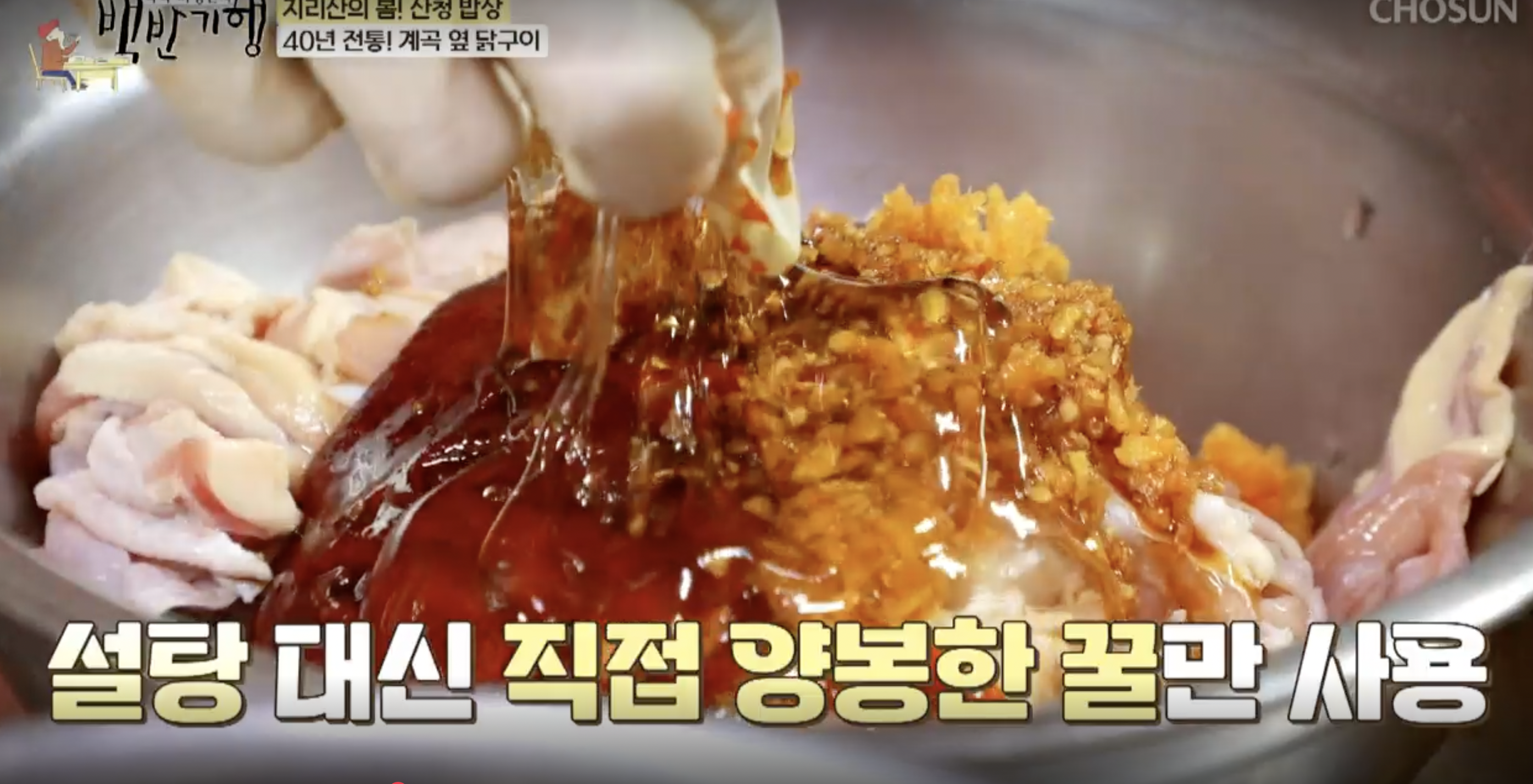 설탕 대신 직접 양봉한 꿀과 직접 담근 고추장을 넣은 양념으로 구이양념을 만든다.