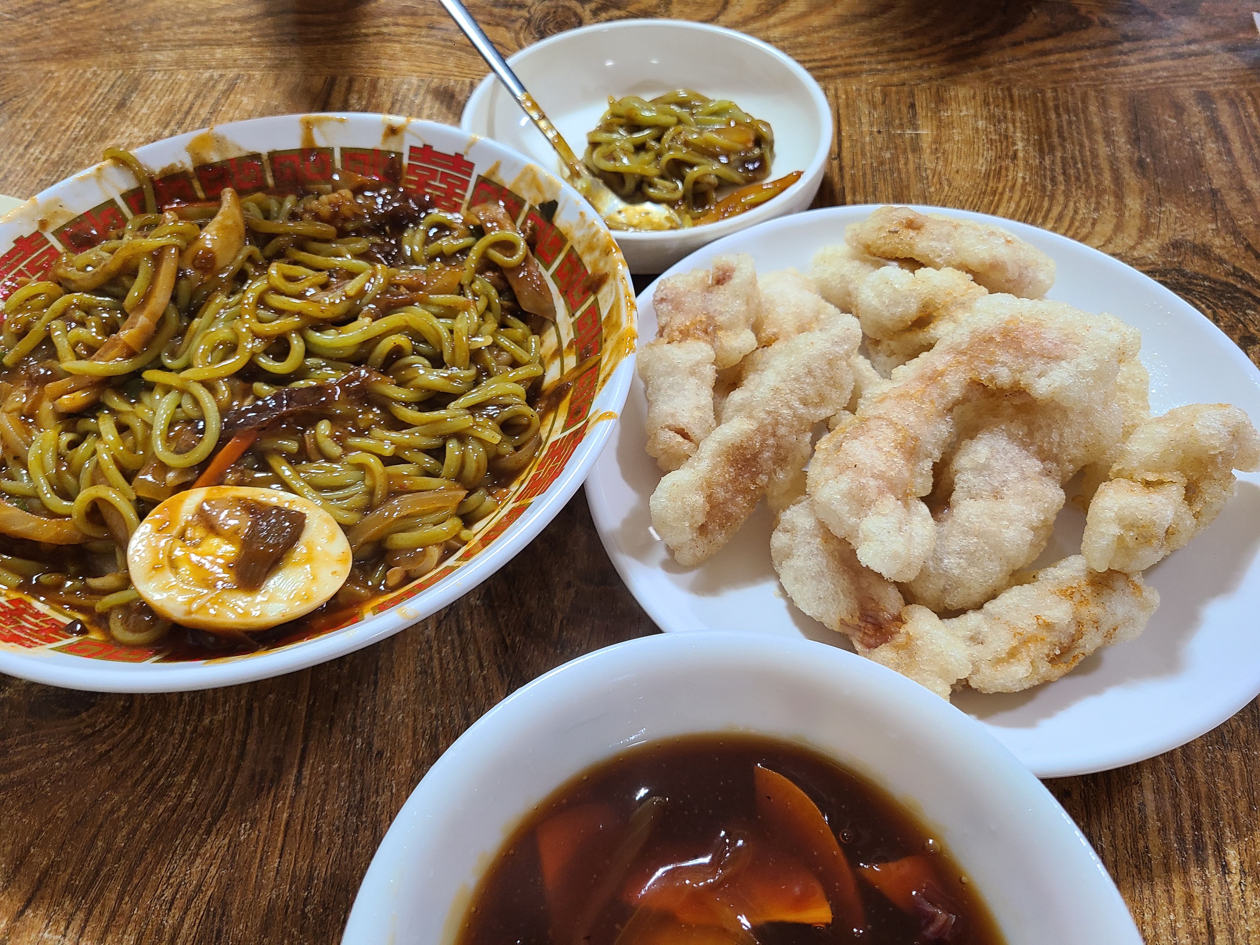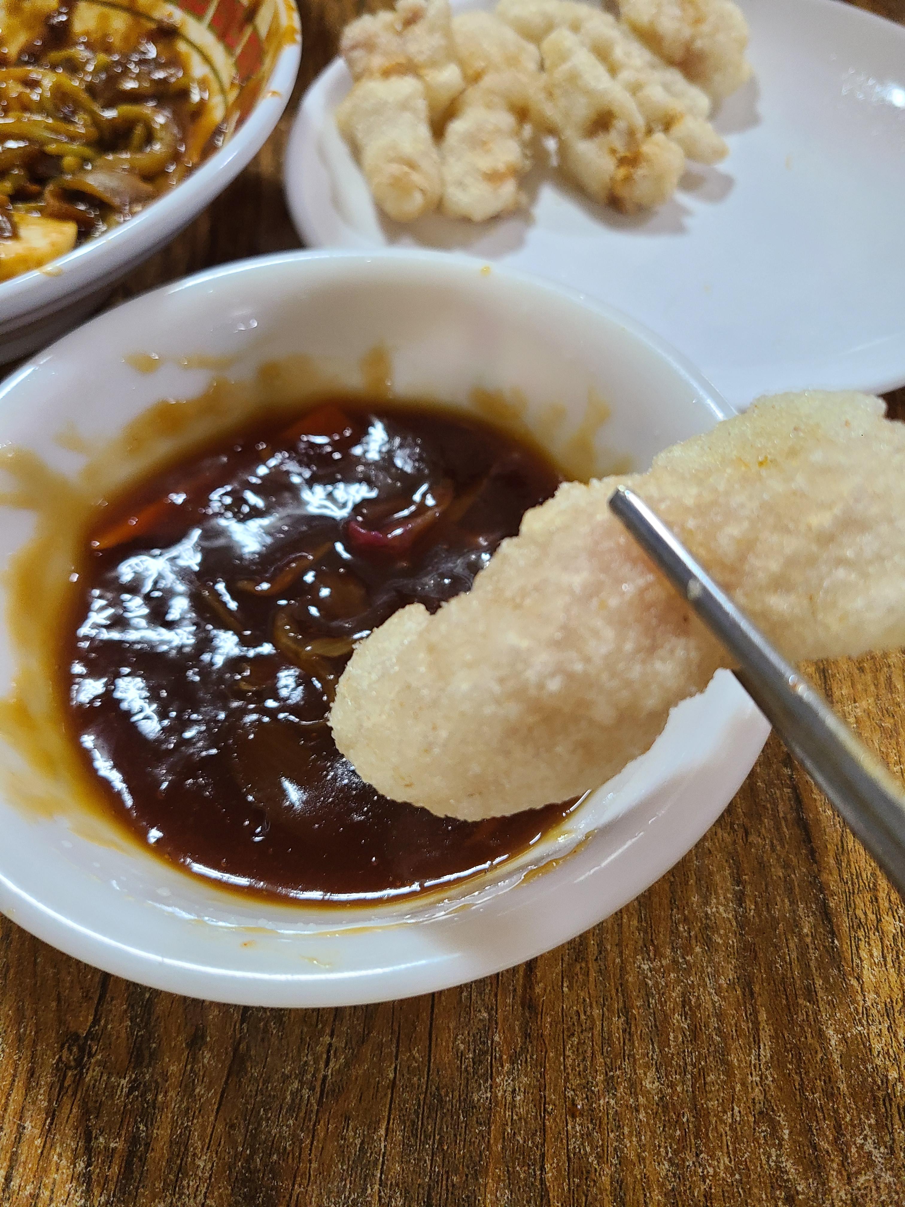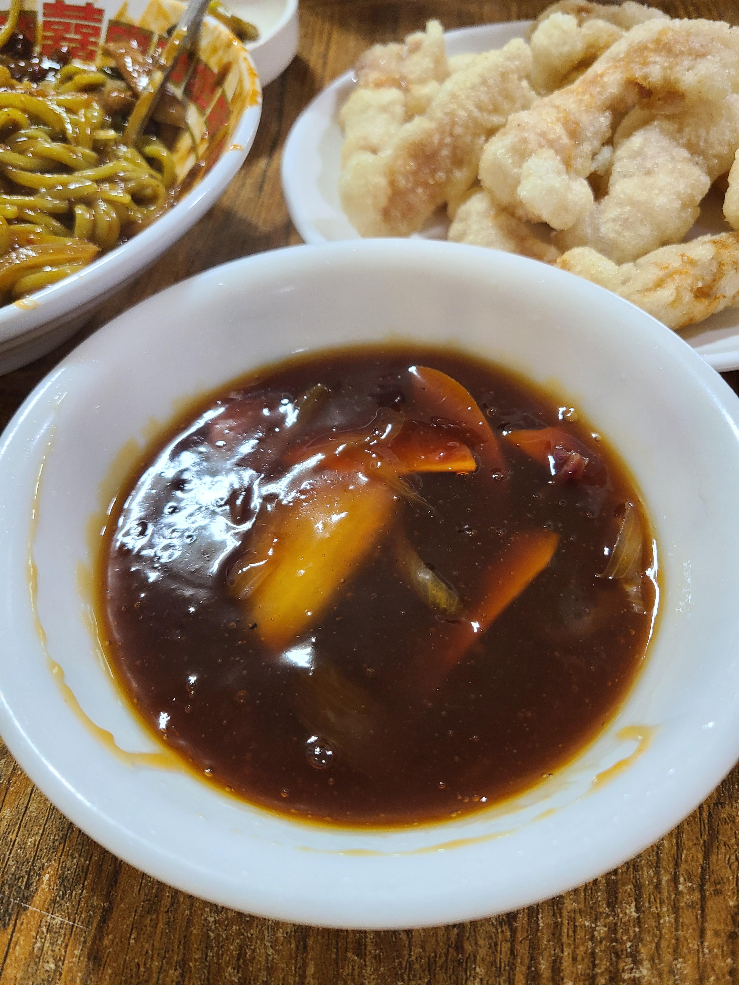 이 소스가 아주 진하고 달아서 초딩입맛들이 좋아할 것 같았고 저는 조금 세게 느껴졌습니다. 그런데 탕수육 자체의 퀄리티는 나쁘지 않았습니다. 가끔 튀김에서 고기 냄새가 좀 나는 곳도 있는데 그런 것 없이 깔끔했고요.