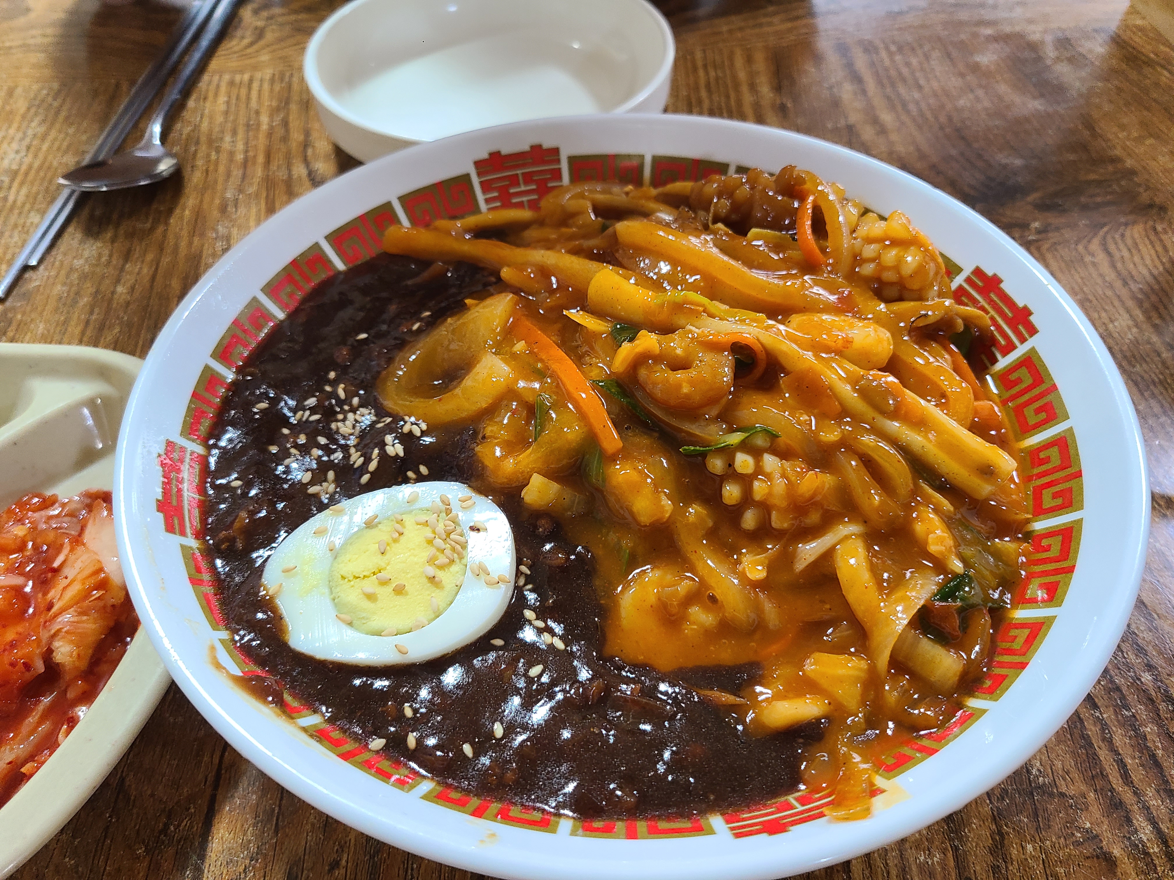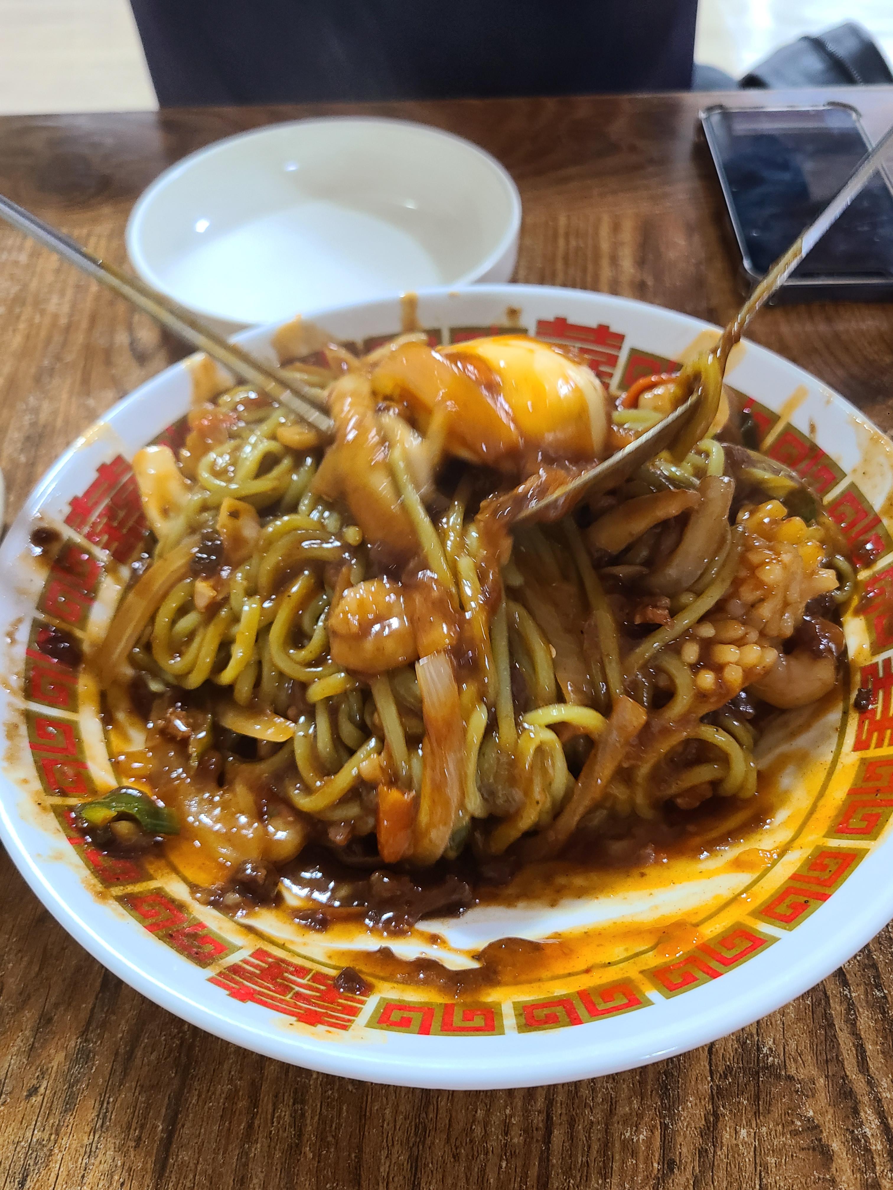 사진에서 보다시피 비주얼이 호감은 아니지 않나요. 하지만 예상 외로 맛이 조화로웠고 짬뽕 소스의 매콤하고 얼큰한 맛이 약간 더 강한 편이라서 한국인의 입맛에 잘 맞는 편입니다.