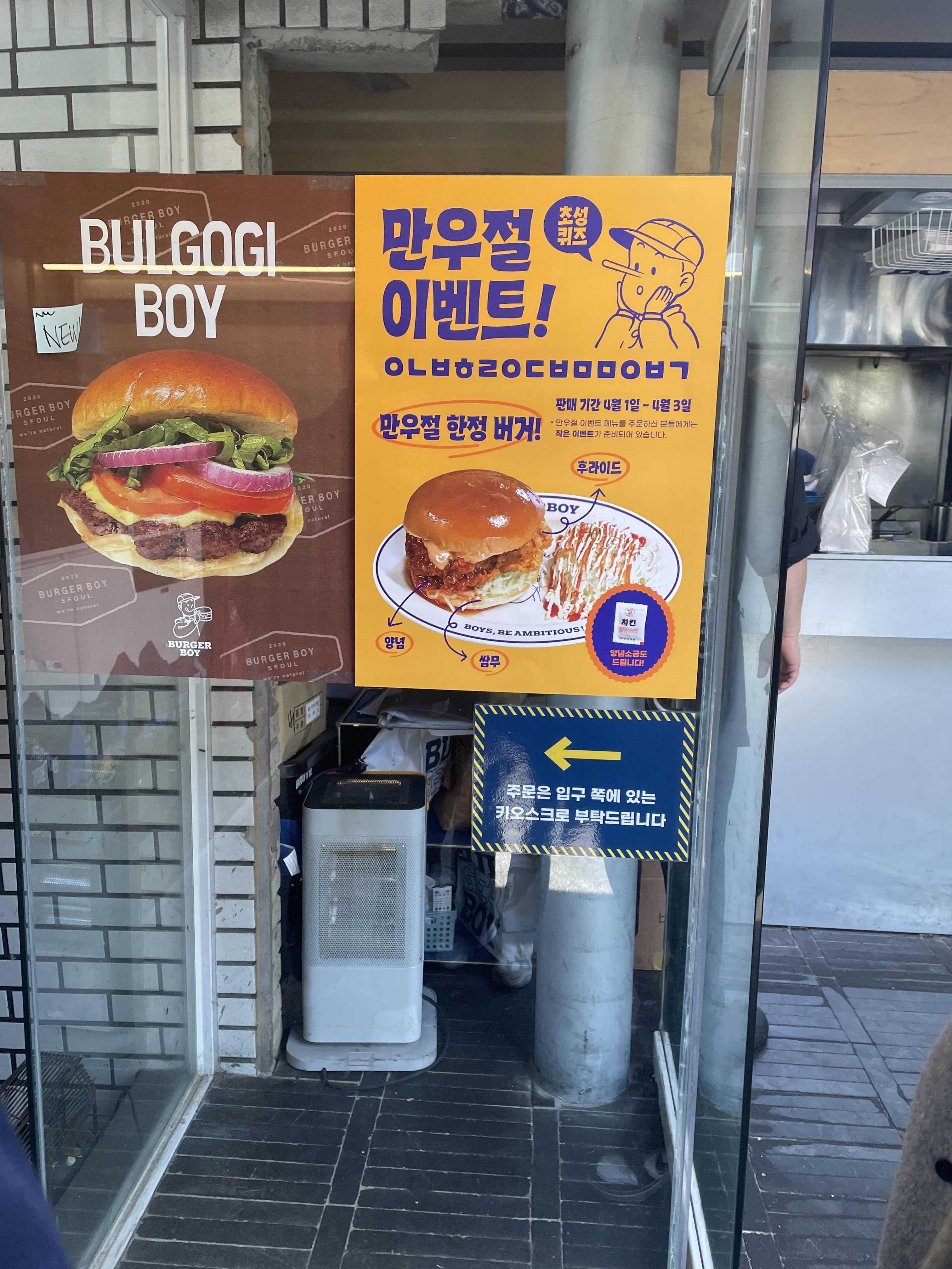 주문은 키오스크로 합니다. 만우절에는 만우절 한정버거를 팔았는데 직원분이 맛있다고 추천도 하시더라고요.
