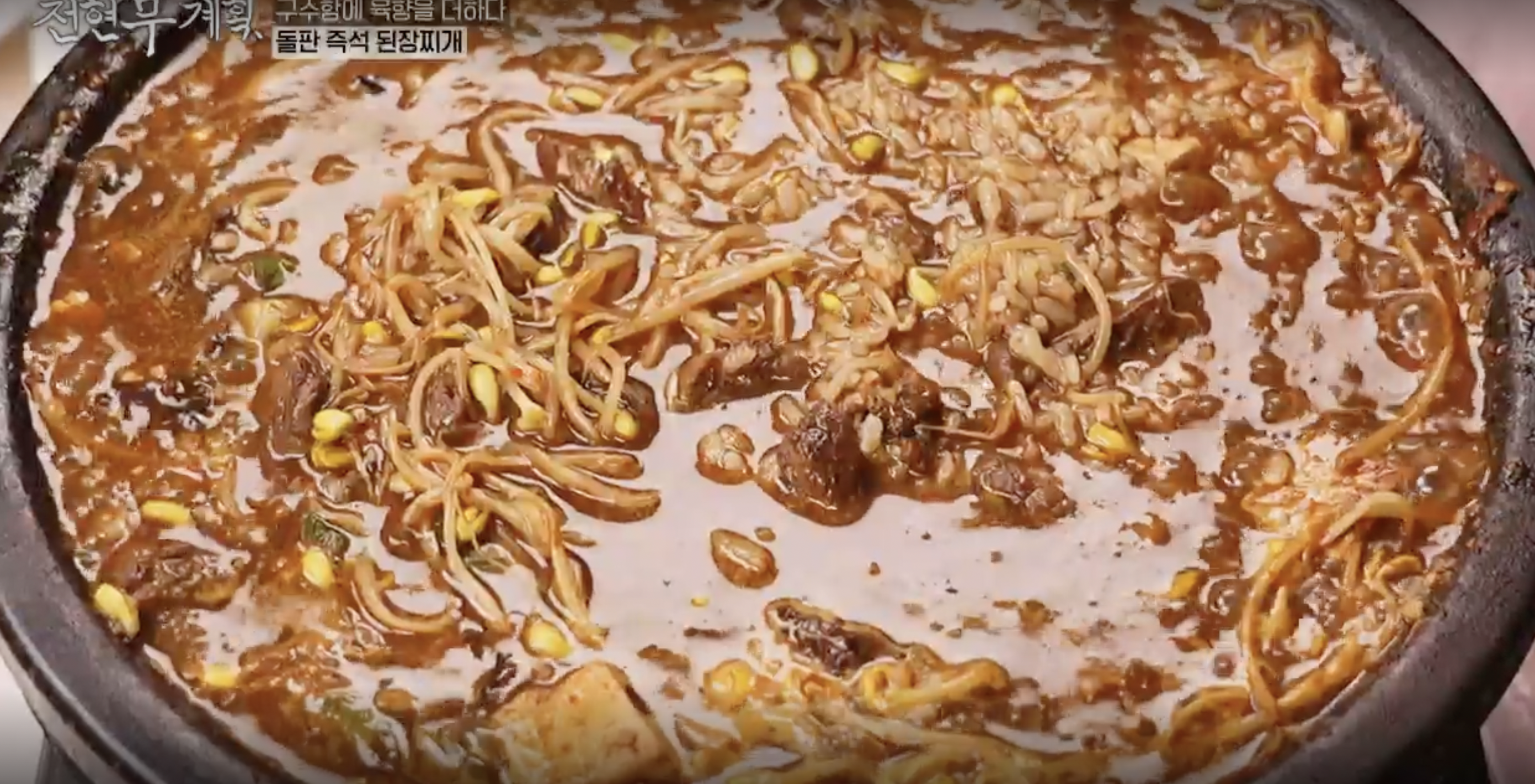 맛 없을 수 없는 된장찌개. 고기를 구웠던 판에 콩나물을 넣어 끓이는 된장찌개. 고기도 잘게 썰어넣어 맛과 식감 모든 것을 잡는다.