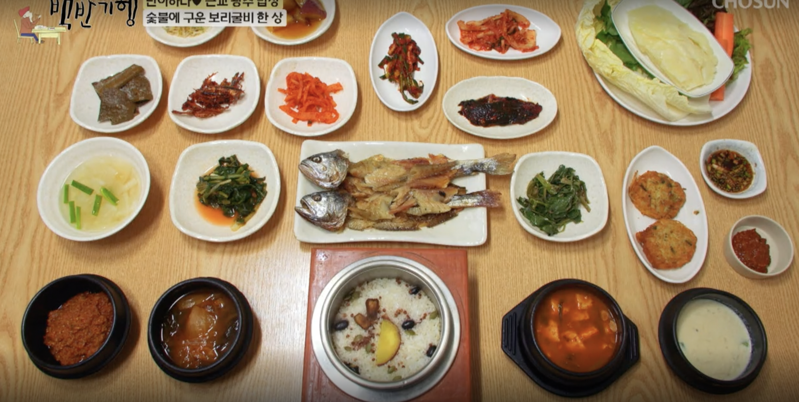 반찬이 10여종이 나온다. 반찬은 때에 따라 조금씩 바뀐다고 한다. 녹두전, 방풍나물 무침, 콩비치, 청국장, 무짠지 등이 나왔다.