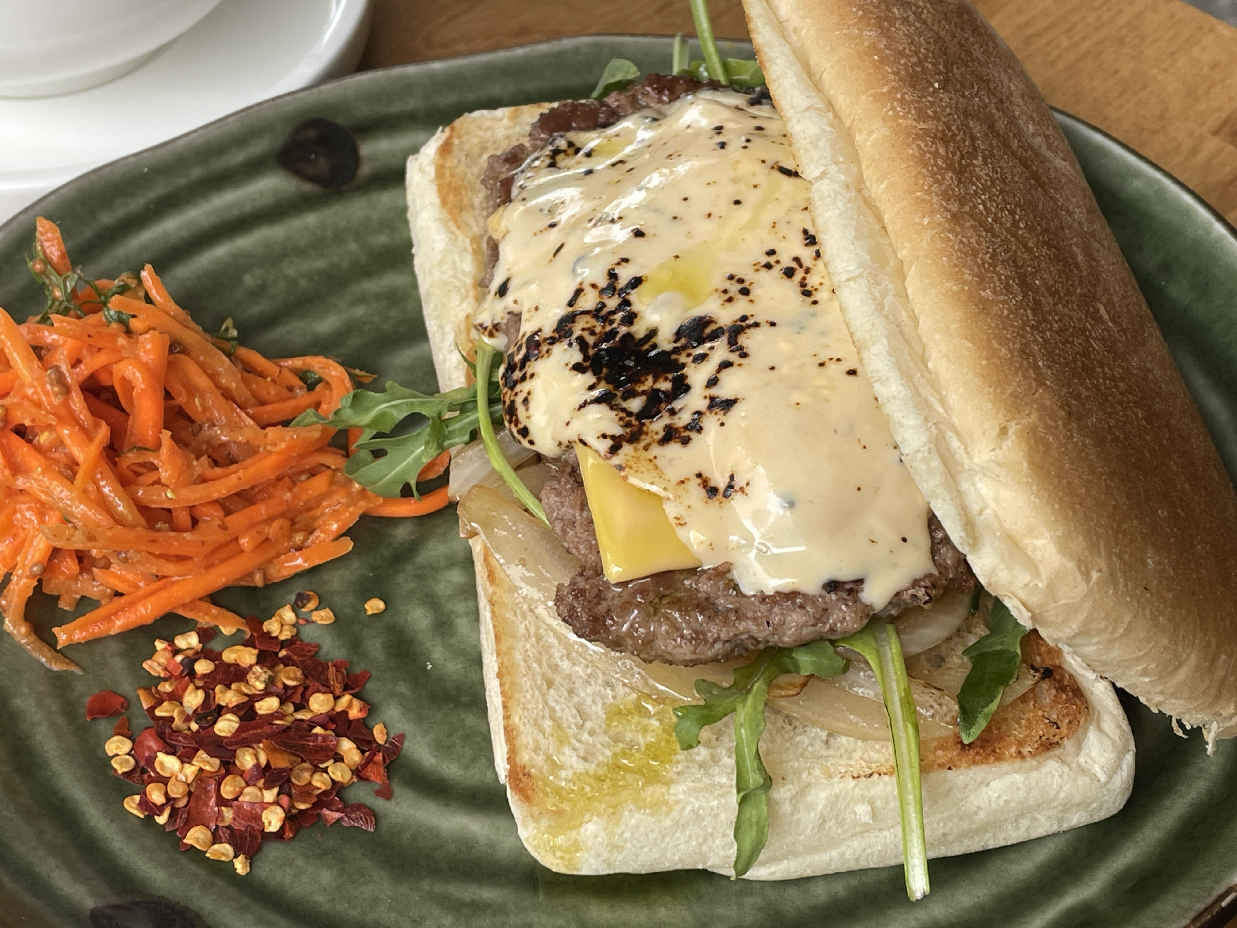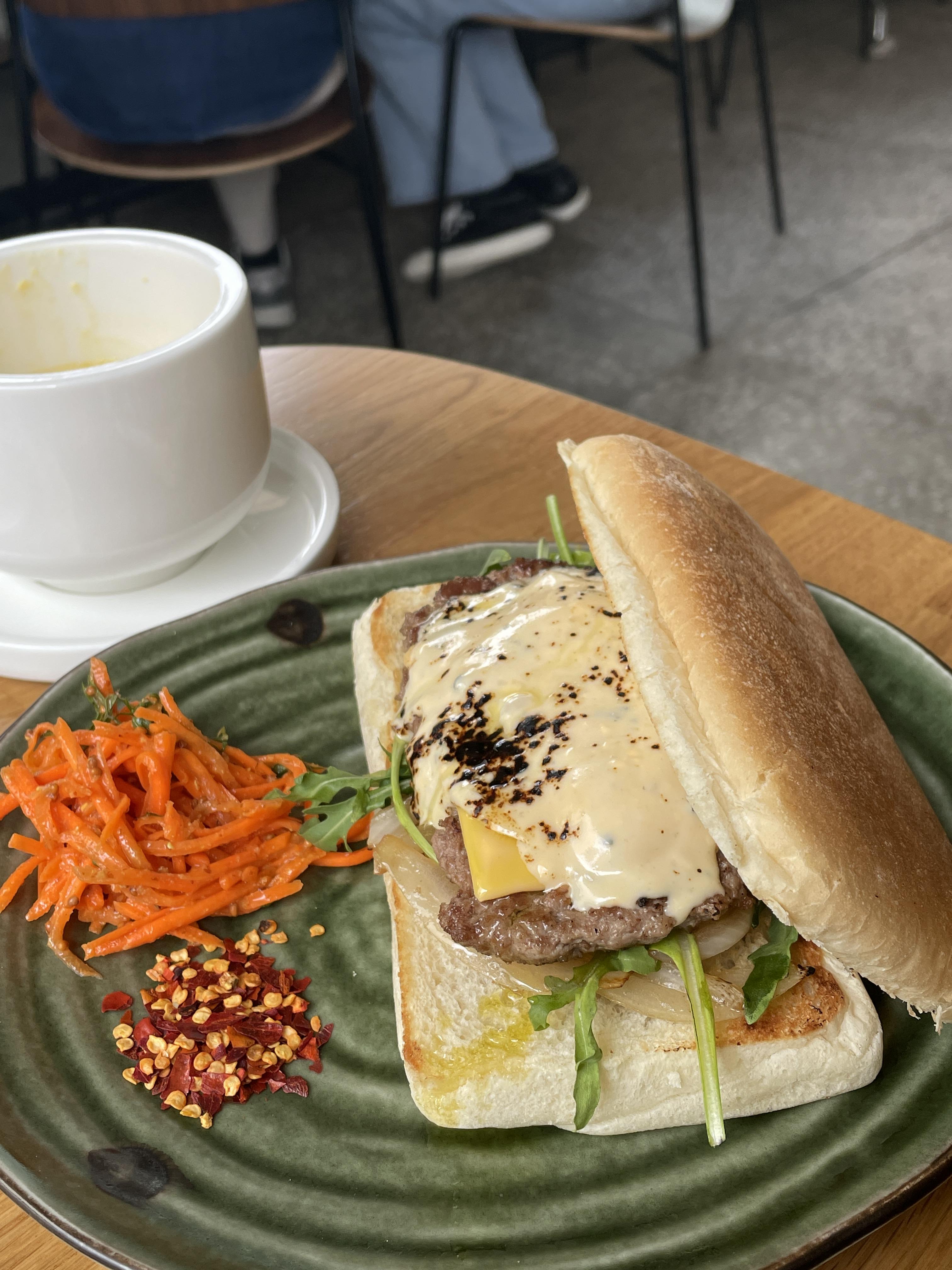 패티와 치즈 소스가 메인인 샌드위치입니다. 매콤한 맛을 조금 더해서 먹는 것이 더 맛있고요.