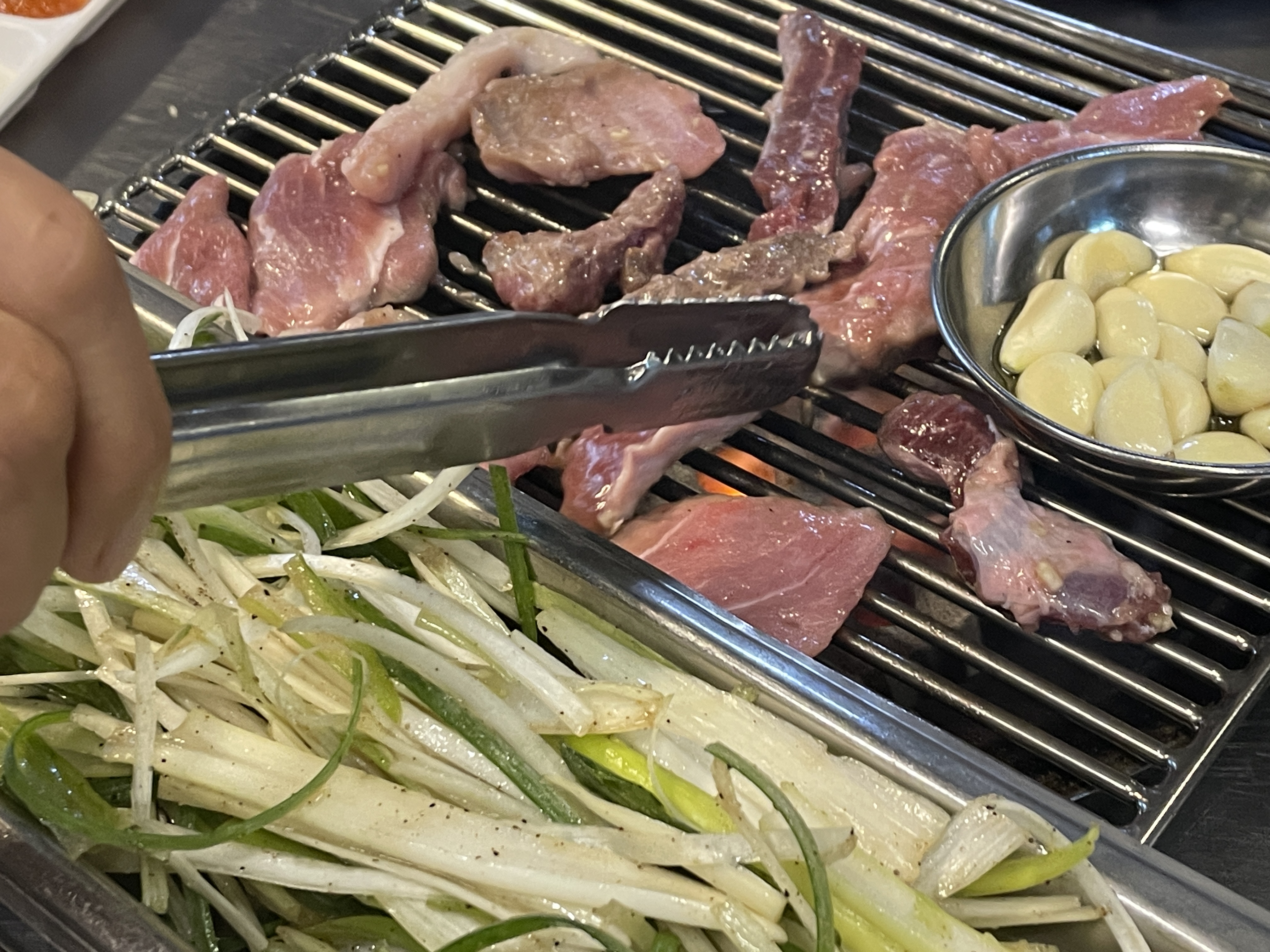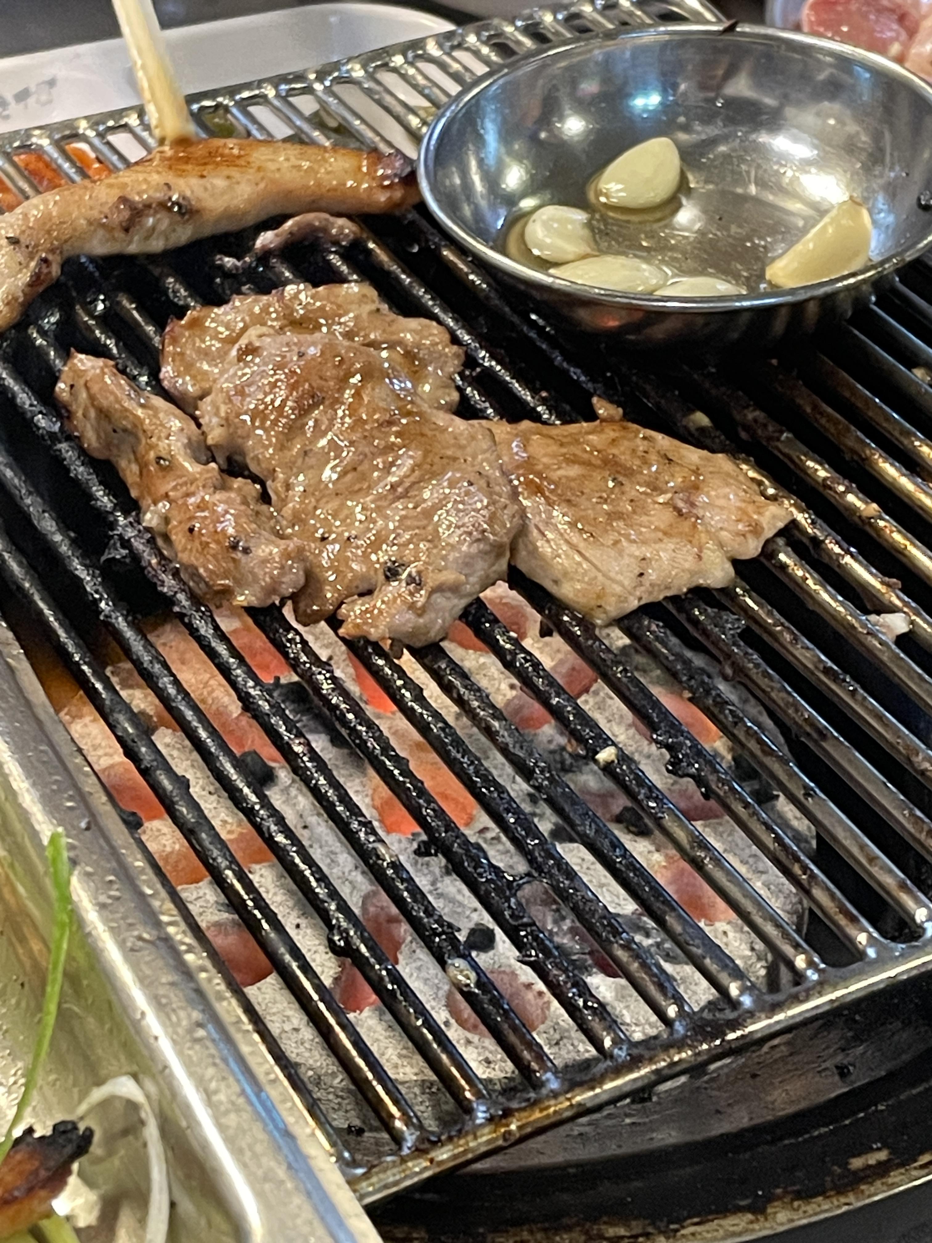 특히 요즘같이 고물가 시대에 더욱 가성비 높게 다가오는 느낌이랄까. 고기는 약간의 마늘 양념이 되어서 나옵니다. 고기 불은 연탄을 사용하고 있어요. 연탄이 몸에 좋은 건 아니지만, 가끔은 이런 포차 같은 감성의 공간에서 연탄이 어울리기도 하고 특유의 향을 맛보는 것 정도는 괜찮지 않나 싶습니다.