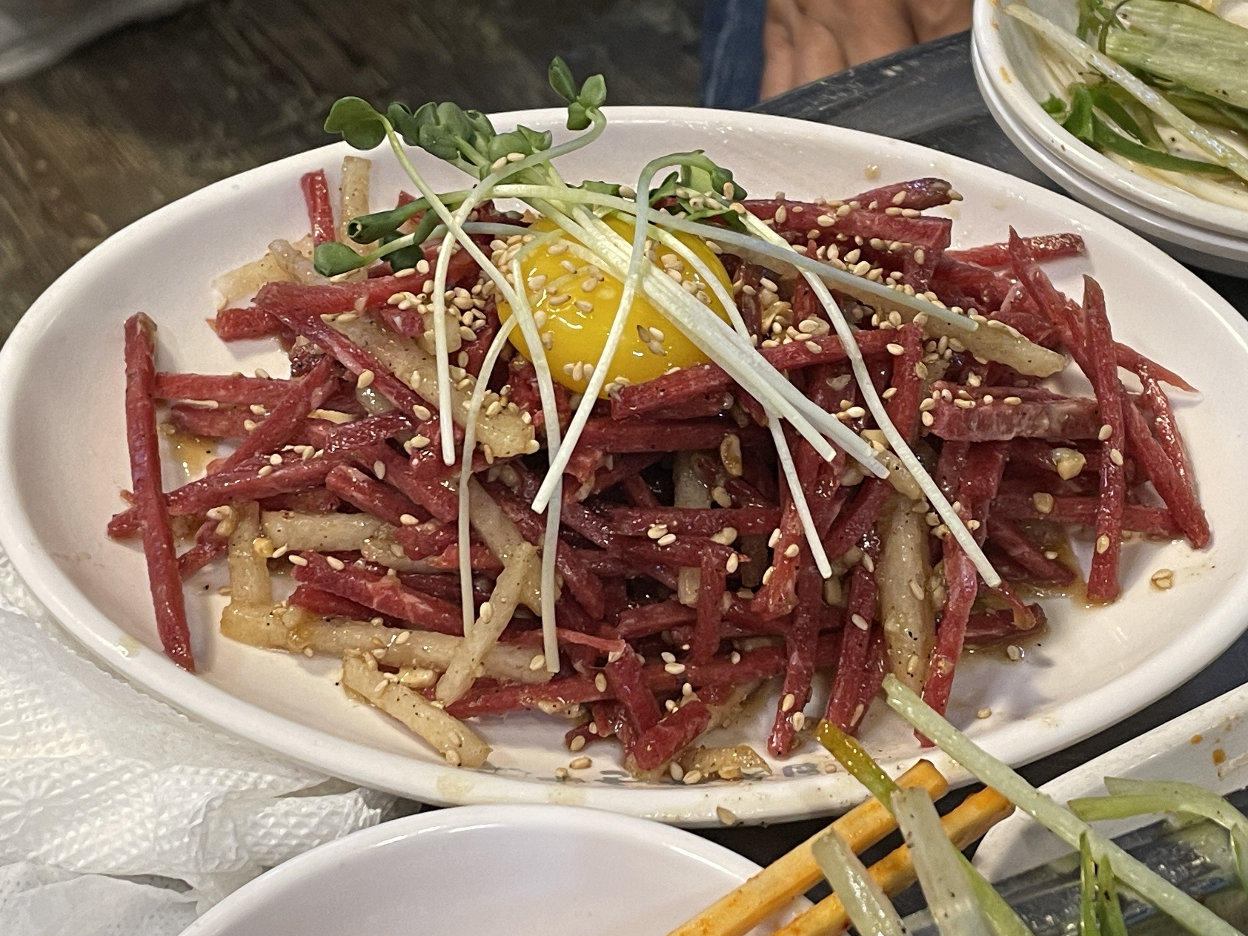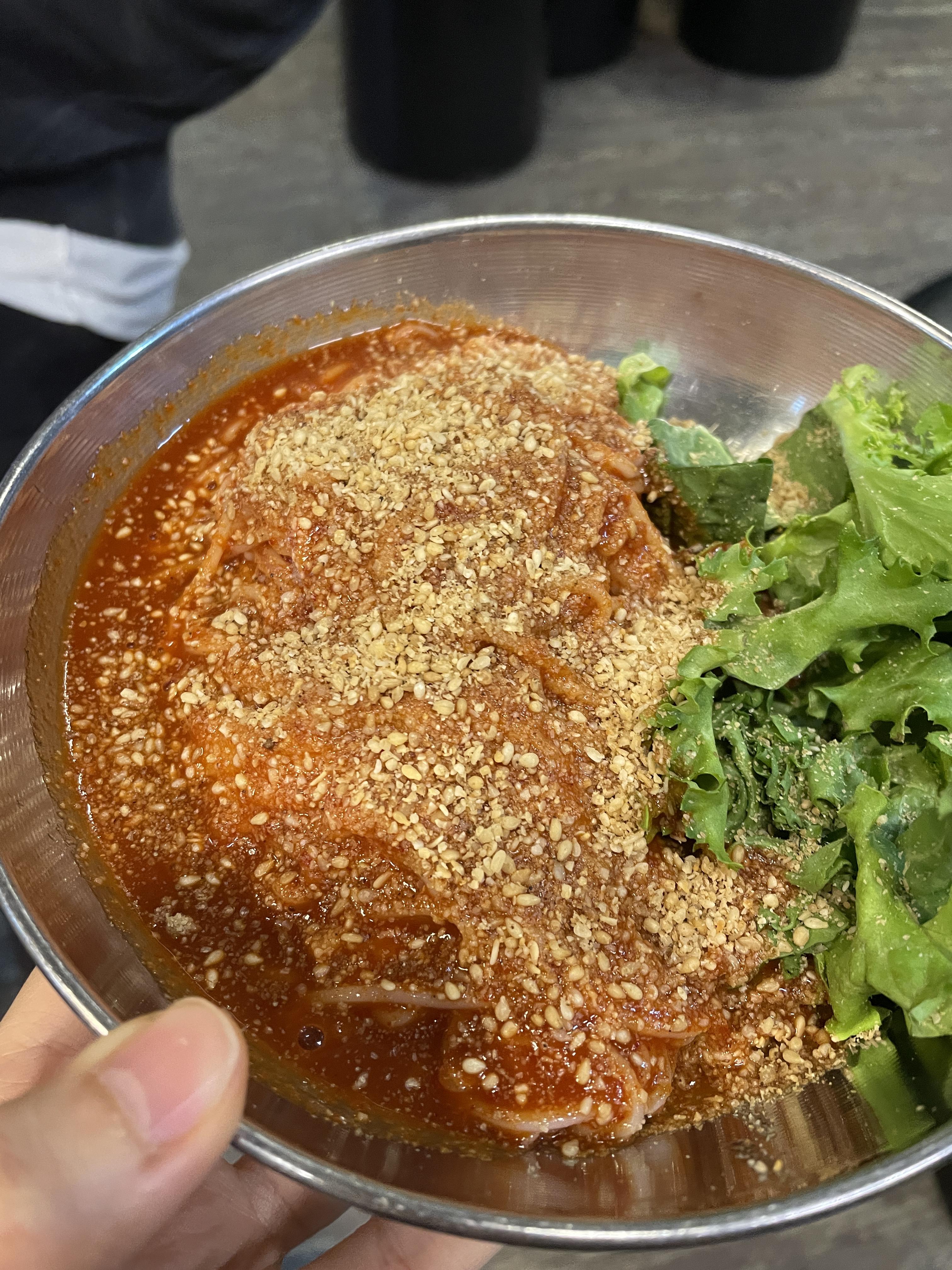 마지막으로 약간 허전한 배는 육회로 채웠습니다. 육회의 고기는 냉동이긴해요. 130g 13,000원. 고기 구워 먹으면서 두세명이 맛보기로 주문해도 부담스럽지 않은 맛과 양이니다. 가격이 가격이다보니 냉동이지만, 양념은 맛있었고 국수와 함께 먹는 것도 좋았어요. 확실히 가성비 맛집임은 틀림없는 것 같습니다. 주머니 얇을 때 편하게 와서 배부르게 드실 수 있는 동네 맛집이라고 봅니다. 다만 위치가 조금 잘 안 보이는 곳이라 찾아와야 한다는 점!