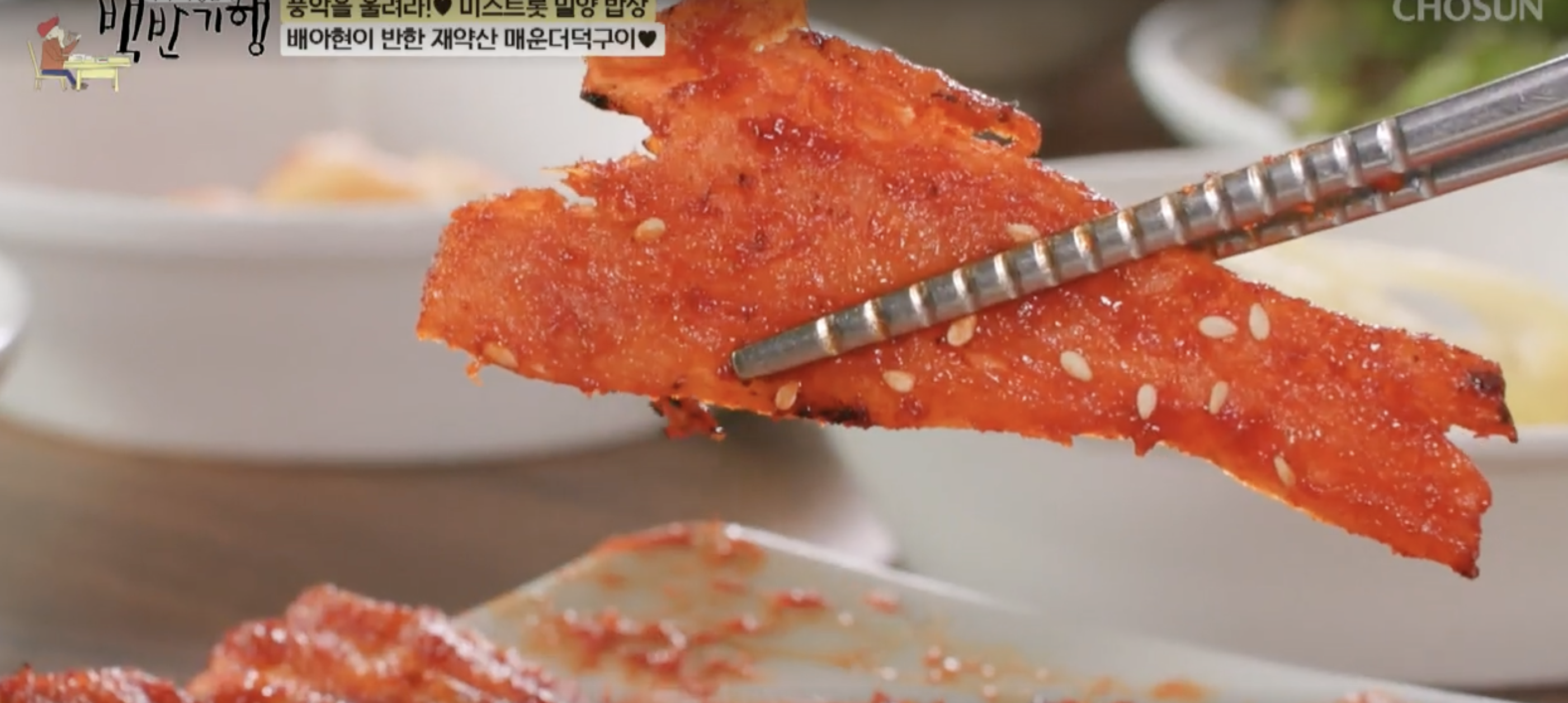 숯불의 좋은 향과 고추장 양념이 매력적인 더덕구이다. 매콤한 맛이 있다.