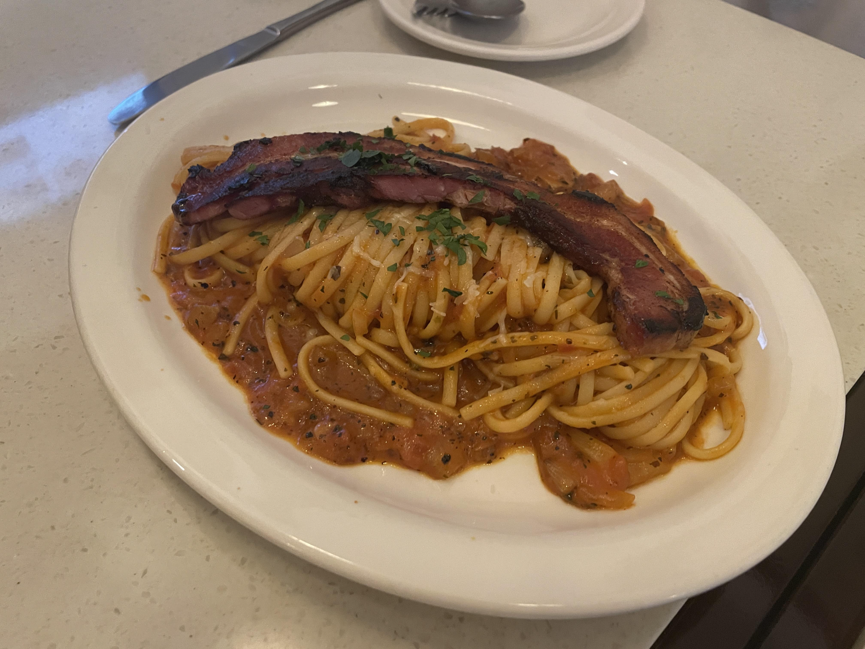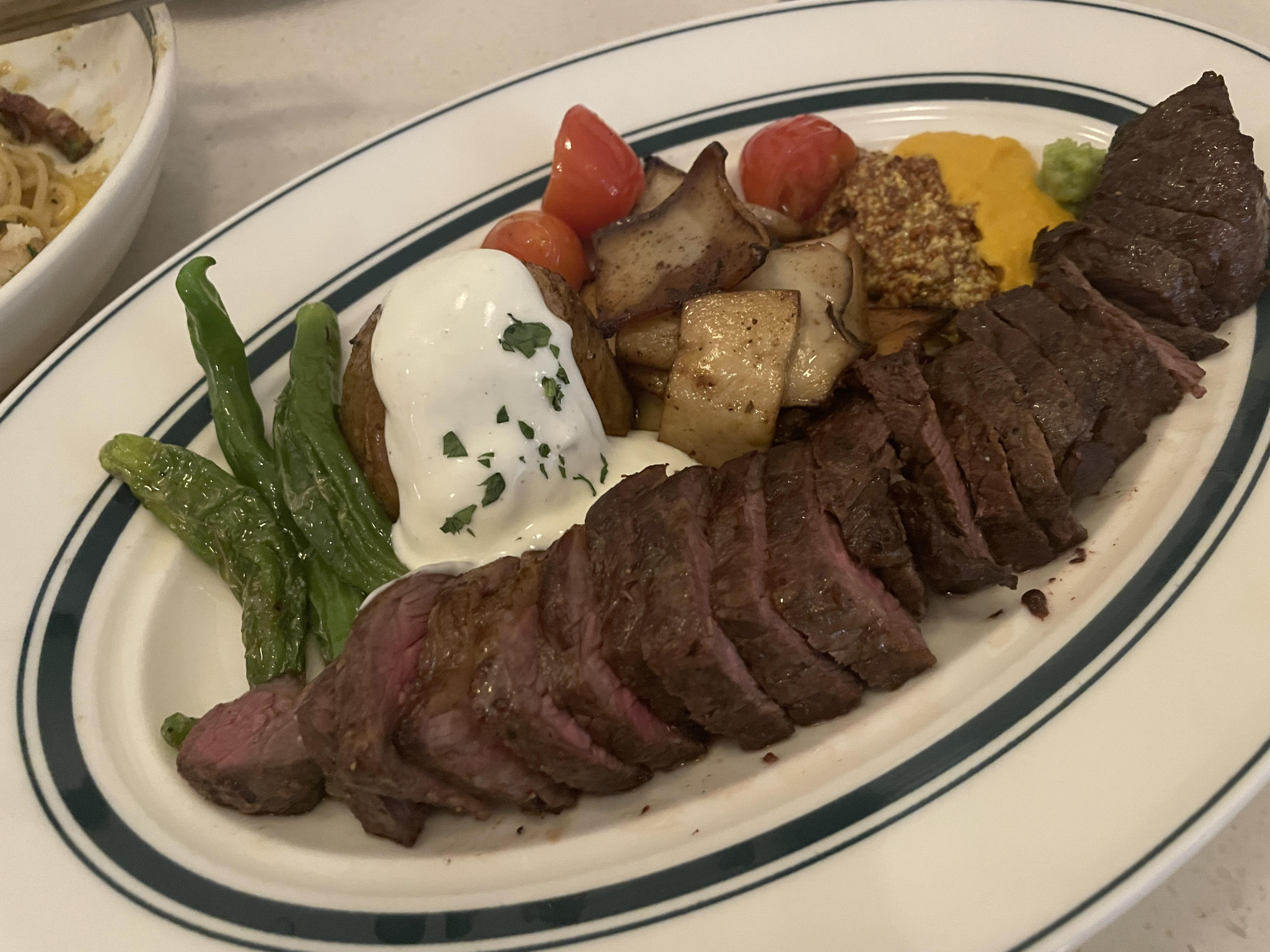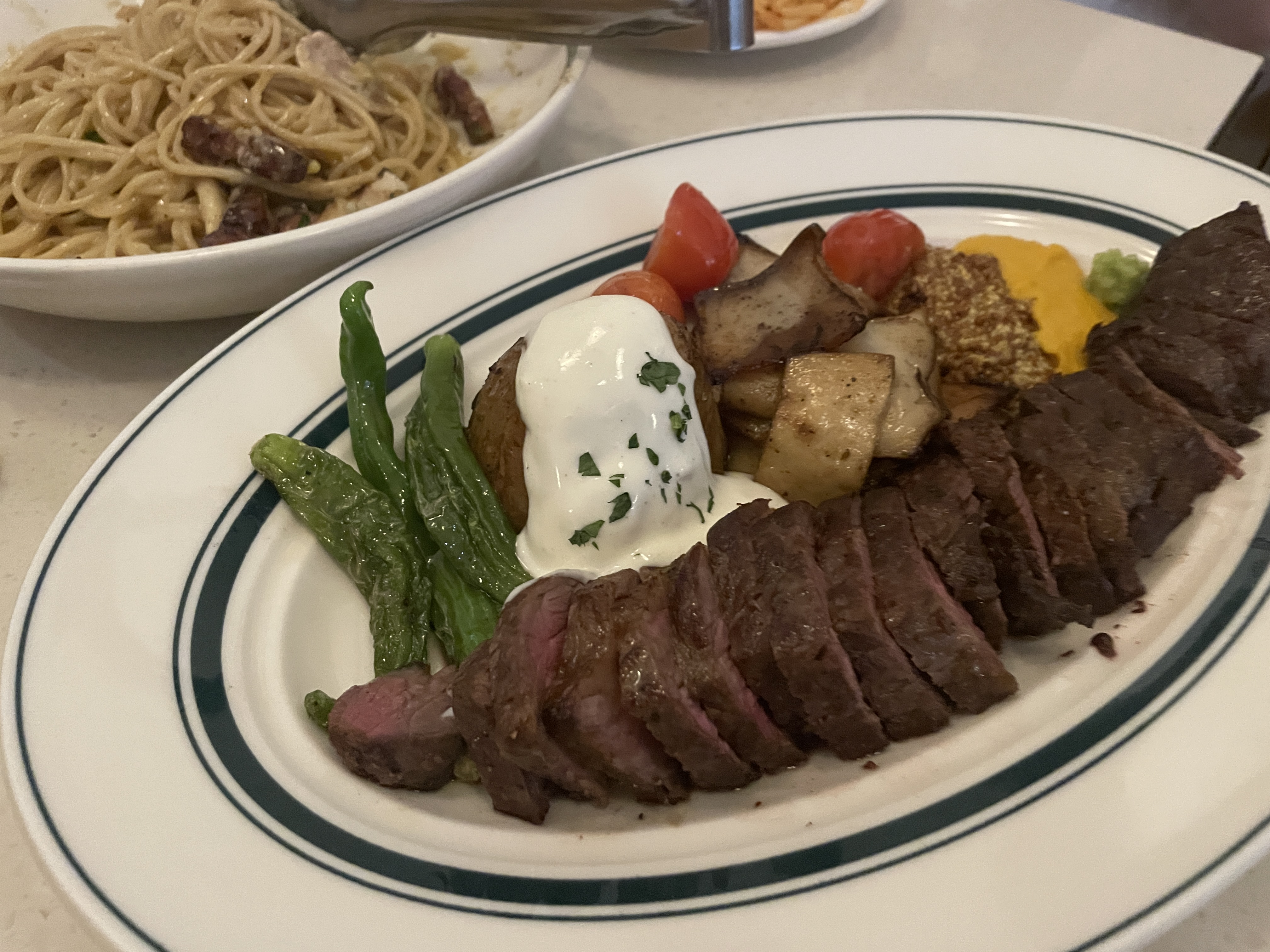 파스타만 먹기에는 너무 탄수화물 대잔치라 단백질 섭취도 할 겸 스테이크도 하나 주문했습니다. 미듐레어라고 하기에는 좀... 미듐에 가까웠지만 다들 맛있게 먹었습니다. 스테이크도 가성비 메뉴인지라 스테이크 전문점 같은 기대만 없다면 가격 대비 양은 괜찮습니다.