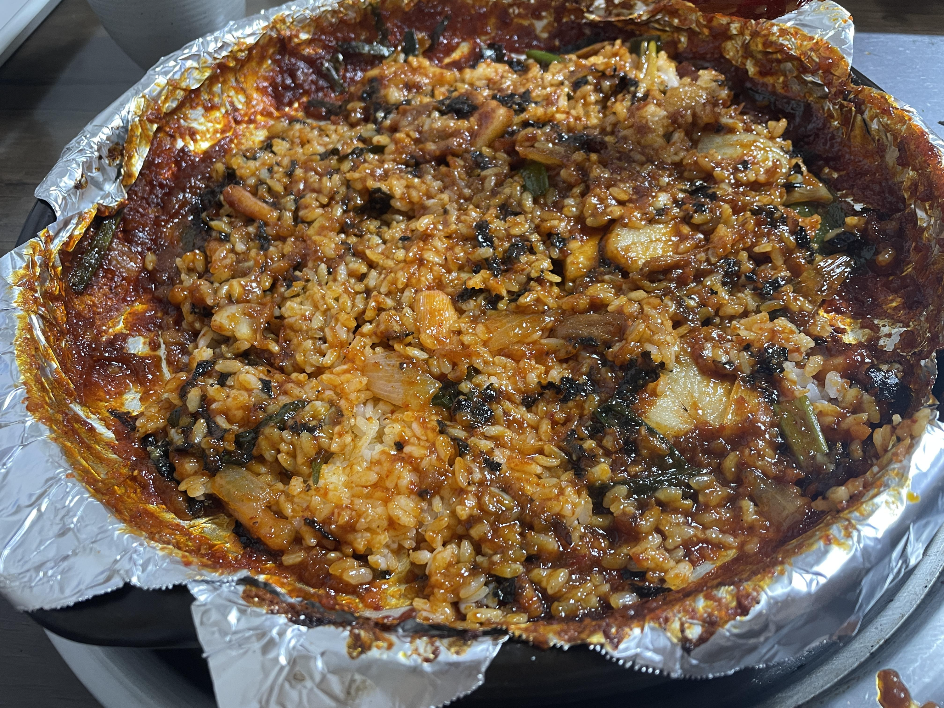 그보다 중요하게 생각해야 할 것은 태우지 않아야 볶음밥을 먹을 수 있다는 사실. 양념이 굉장히 꾸덕하고 진해서 정말 타고 눌러붙기 좋은 스타일입니다. 그렇기 때문에 자주 자주 뒤적거리는 것에 집중! 거의 다 익으면 불을 꺼줍니다. 뚝배기라서 열기가 오래 가는 점이 좋네요.