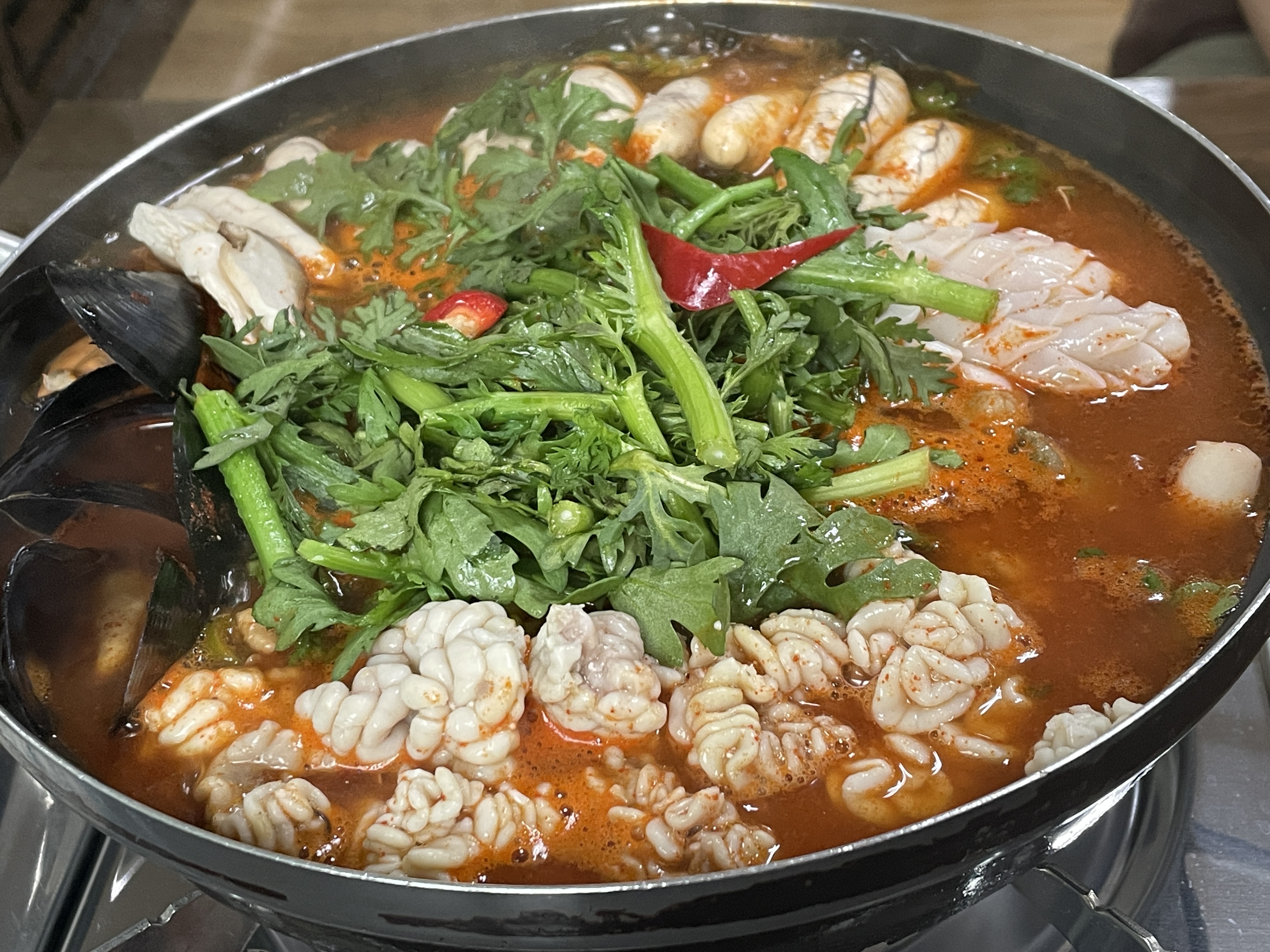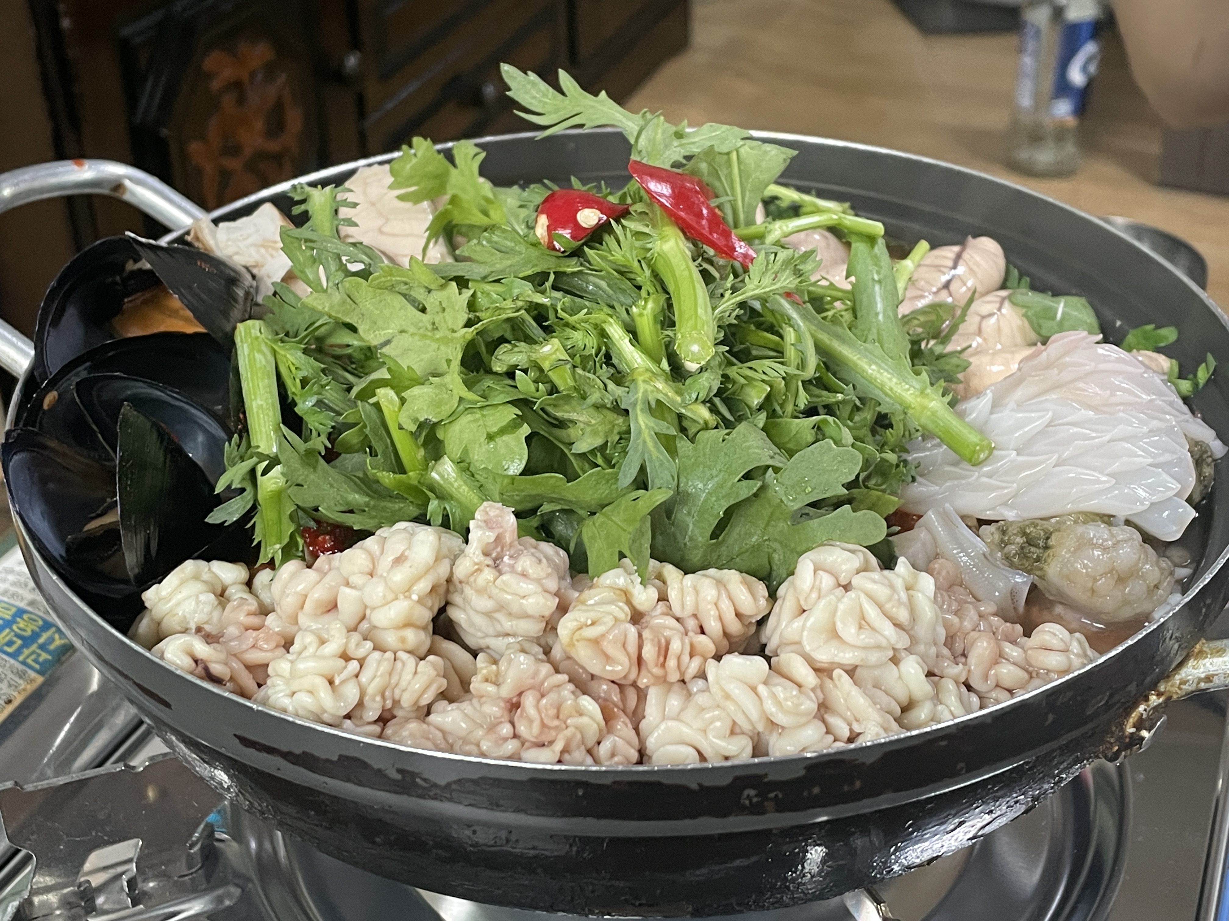 반찬입니다. 반찬은 젓갈은 왜 있지? 싶은 느낌이었고 감자샐러드는 알탕이 끓기 기다리면서 먹기 좋았습니다. 콩조림은 너무 단단하기도 했고 중국산이라 굳이 먹지는 않았습니다. 콩나물은 색에 비해 의외로 짜지 않았습니다.