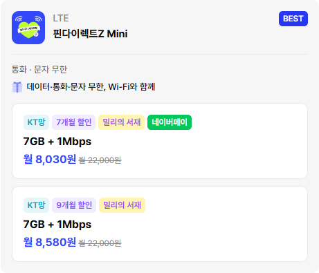 알뜰통신사의 요금제는 1~2만 원대에 무제한 데이터를 제공하기 때문에, 통신사 요금제보다 훨씬 경제적입니다. 위 이미지의 핀다이렉트Z Mini가 제가 사용하는 요금제예요. 한달에 8,000원.
