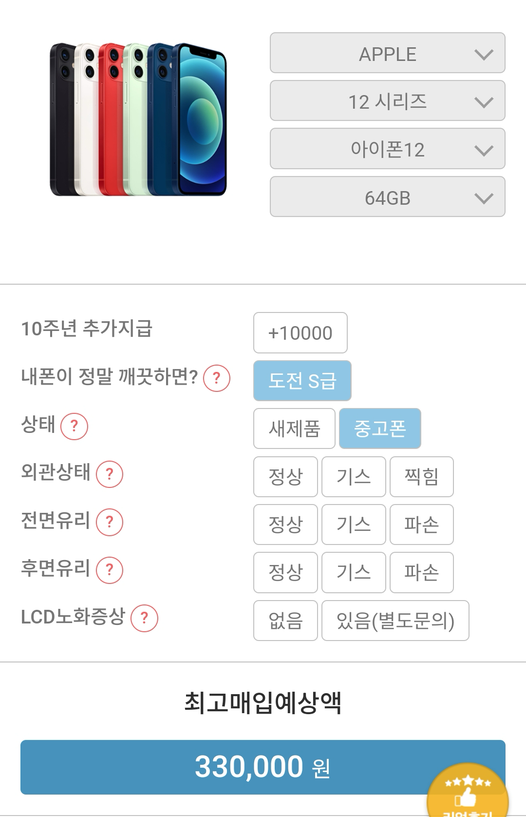저 같은 경우는 아이폰12 64기가 기종인데요. 아무런 이상이 없는 S급(업체에 따라서는 A급)의 가격도 업체에 따라 22만 원~33만 원까지 천차만별이었어요.
