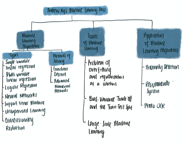 이 과정은 기계학습 분야의 핵심에 대한 폭넓은 조감도를 제공합니다. 다음은 수업에서 다루는 개념의 마인드맵입니다.