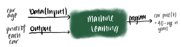 기계학습은 컴퓨터에 일부 입력(input) 및 출력(output)을 제공합니다. 시간이 지남에 따라 기계는 입력과 출력 간의 관계를 더 잘 학습합니다. 새로운 입력을 제공하면 예측된 출력을 알려줄 수 있습니다. 예를 들어 Elon은 중고 Tesla를 구매할 계획입니다. 그는 Craigslist에서 Tesla 차량 가격에 대해 조사한 결과 거의 새 Tesla 차량이 약 40,000달러부터 시작한다는 것을 발견했습니다. 그는 또한 자동차가 1년이 될 때마다 Tesla 가격이 약 $1,000씩 떨어진다는 사실도 알고 있습니다. 그런 다음 그는 5년 된 자동차가 35,000달러라고 예측합니다.