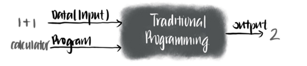 이것은 우리가 기존 프로그래밍을 정의한 것과는 완전히 다릅니다. 전통적인 프로그래밍에서 우리는 컴퓨터에 짜여진 규칙(program)와 입력(input)을 제공합니다. 차례로 우리는 출력(output)을 기대합니다. 예를 들어 계산기 프로그램에 1+1 입력을 제공하면 출력이 무엇인지 모두 알 수 있습니다.