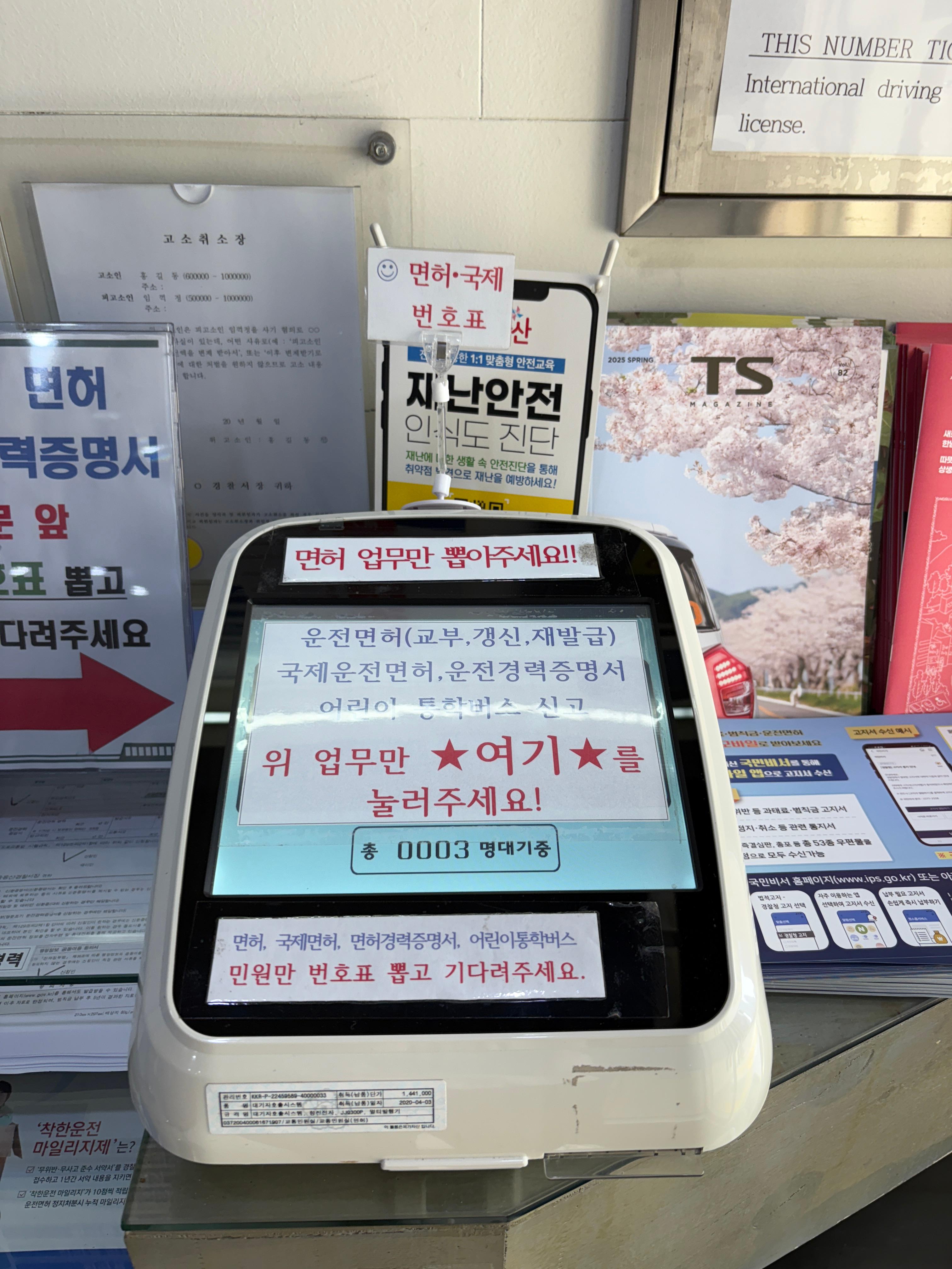 일단, 저는 국제면허증을 발급 받기 위해서는 이 번호표 기계에서 번호표를 뽑아야 합니다. 평일 점심 기준으로 3명 대기가 있었고 3분 정도 기다렸나 대기시간이 적었습니다. 확실히 경찰서 민원실이 대기가 적은 것 같으니 참고하시면 좋을 것 같아요.