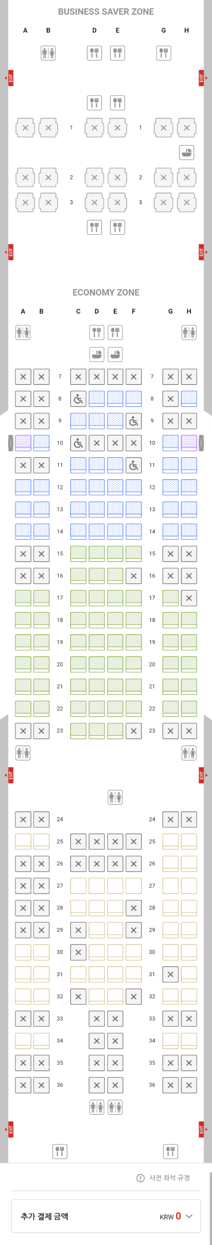 온라인 체크인으로 무료 좌석 지정을 할 생각이더라도, 그 전에 미리 좌석 구매 메뉴로 들어가서 좌석 배치도와 위치별 가격 정보를 확인해 두면 좋다.